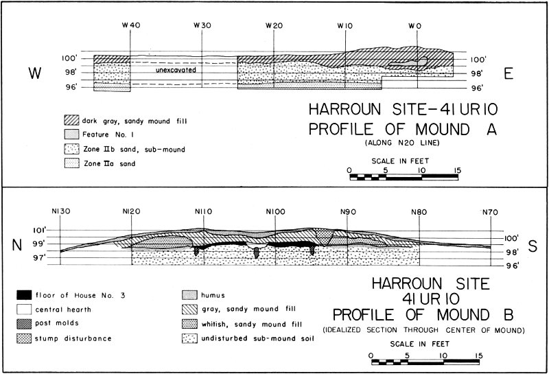 In the mound, horizontal plans were drawn to scale at 0.5-foot intervals as the squares were leveled, all features, soil changes, and major disturbances being recorded. Representative profiles were also drawn to scale so as to provide a record of the mound structure and of the relationship of the mound to the floodplain on which it rested.