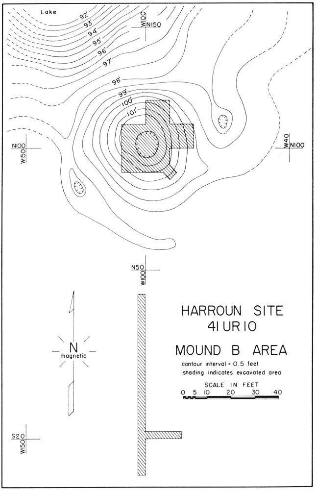 As a result of the investigations at the Harroun Site in 1957, 1958, and 1959, all four of the mounds were completely excavated except for certain marginal portions and several check blocks. In addition, the area surrounding the mounds was tested sufficiently to show that there was no general area of occupation near the mounds. The excavation of the Harroun Site was supervised by the senior author. The junior author served as an assistant archeologist during both the 1957 and 1958 seasons.