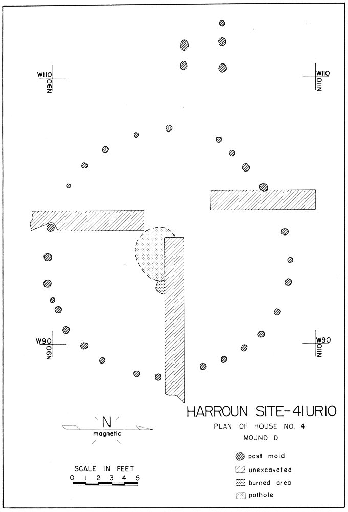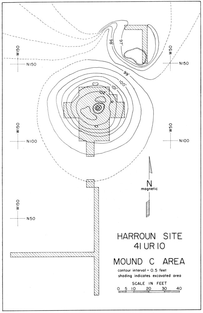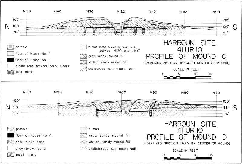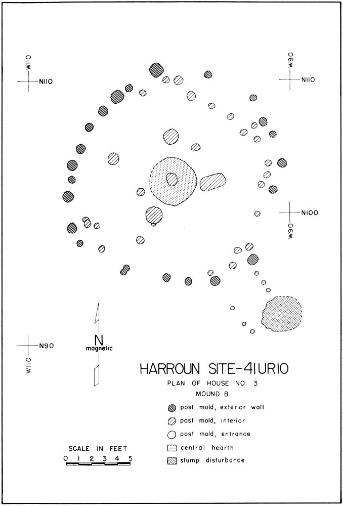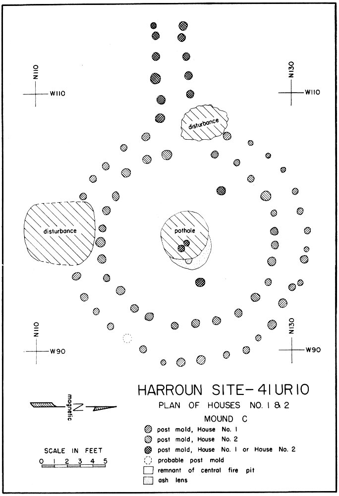 There were two houses at Mound C, the smaller one (14 feet in diameter) superimposed over the larger one (18 feet in diameter). Each apparently had a centrally located hearth and one, or possibly both, had an extended entranceway on the west side. Two interior roof support molds were related to the earlier house, but none were found for the later one.