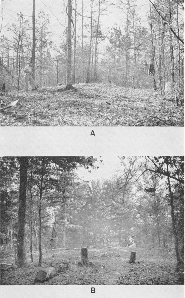 Fig. 11. A, Mound A prior to excavation, view looking southwest; B, Mound C prior to excavation, view looking northeast. Mounds B and D were of approximately the same size and shape as Mound C.