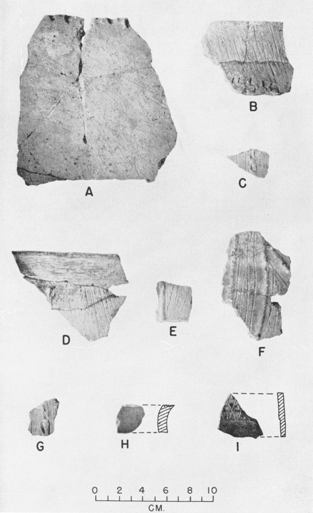 Fig. 13. A and B, sherds of type Bollard Brushed; C-G, sherds of type Pease Brushed-Incised; H, sherd of Coles Creek Incised or Chase Incised (?); I, sherd of Beldeau Incised (?). Profile exteriors are to the left.
