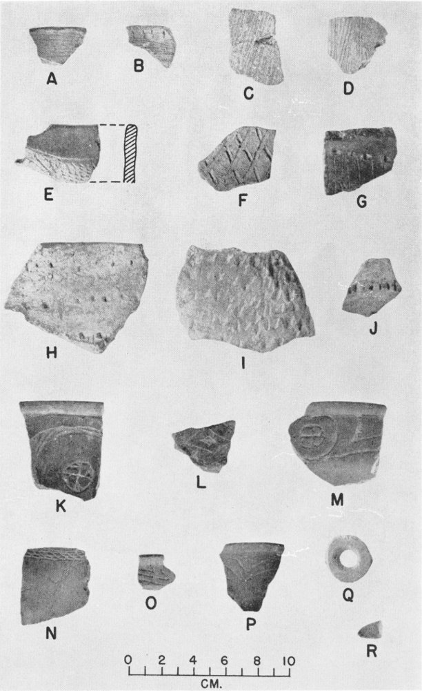 Fig. 14. A and B, brushed rimsherds; C and D, brushed body sherds; E, sherd of type Crockett Curvilinear Incised (exterior of profile to the left); F, sherd of type Maydelle Incised (?); G, incised body sherd; H and I, punctated sherds; J, appliquéd sherd; K-M, sherds of type Ripley Engraved; N-P, sherds of type Taylor Engraved; Q, perforated disc made from sherd; R, fragment of appendage from pipe or effigy vessel.