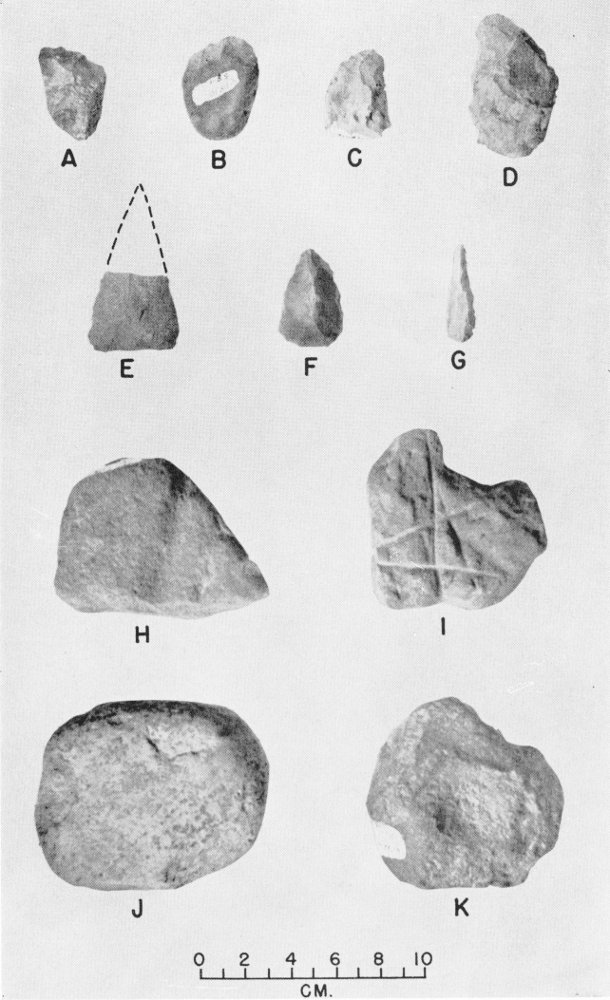 Fig. 16. Stone artifacts. A-D, worked nodules; E and F, bifacial blades; G, drill; H and I, grooved stones; J, mano; K, pitted stone.