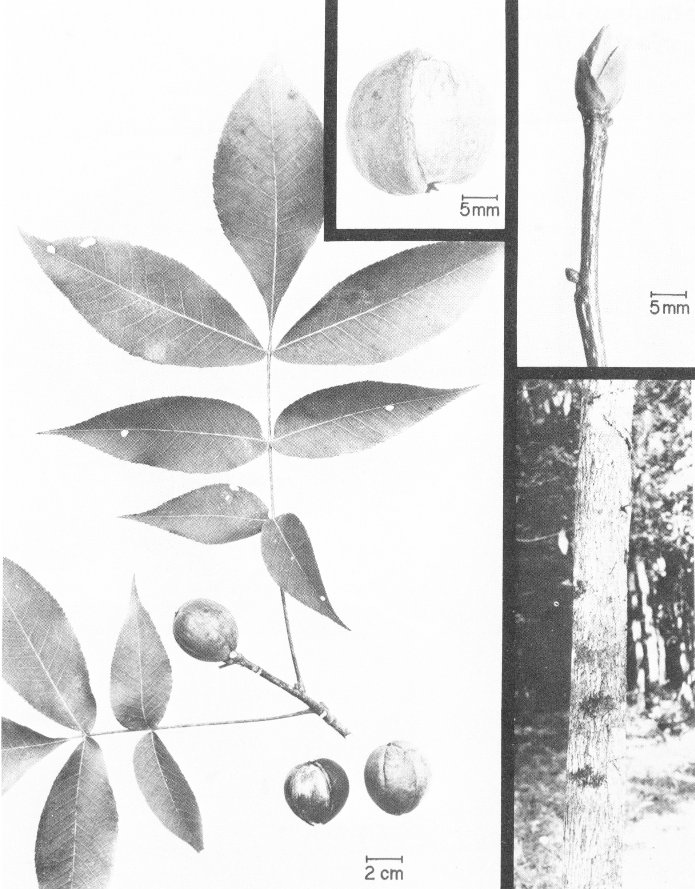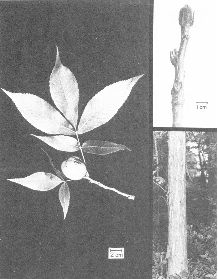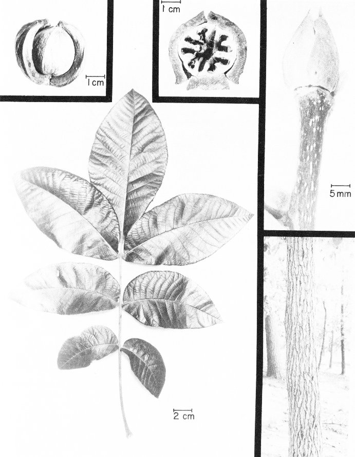 Bark grayish, tight, marked with distinct diamond-shaped ridges and furrows. Branches stout, drooping to spreading and ascending. Twigs 10 to 12 mm in diameter, conspicuous leaf scars. Buds (terminal) 10 to 15 mm long, 5 to 8 mm in diameter, scales imbricate. Leaves alternate, deciduous, odd-pinnately compound, 20 to 40 cm long with 5 to 7 drooping leaflets; yellow hairs and glandular hairs on lower leaflet surface, apex acuminate, margin finely serrate, base obtuse, on very short petiolules. Flowers unisexual, appearing in spring with developing leaves, staminate in 3-parted drooping catkins, pistillate terminal on new growth. Fruit subglobose to obovate, 3 to 5 cm in diameter, husk 1 cm thick, slow to open, shell of nut thick and hard, meat sweet.