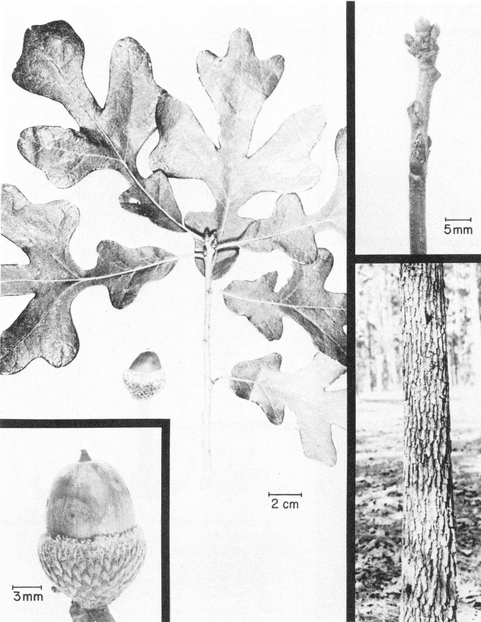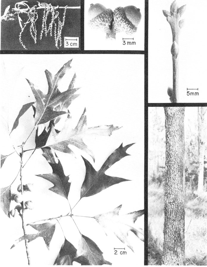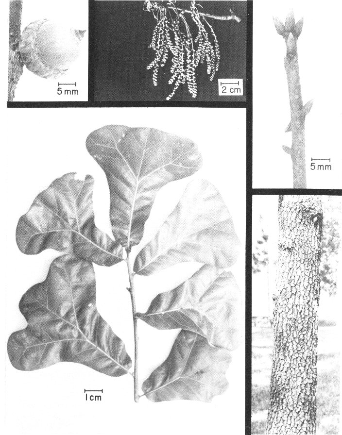 Bark dark gray to gray-black consisting of appressed scales in narrow flat ridges with shallow furrows. Branches stout, spreading to ascending. Twigs 2 to 4 mm in diameter, reddish, lightly fluted. Buds ovoid, 10 to 15 mm long, angled, scales pubescent with dark margins. Leaves alternate, tardily deciduous, persisting into December, simple, oval to oblong, 12 to 20 cm long, 7 to 8 cm wide; with 5 to 11 lobes, major lobes opposite each other, large rounded sinuses extending nearly to the midrib, margin entire with occasional bristle-tipped teeth near the apex of the lobes, dark green above, permanently pubescent below, sometimes thinly so, varying from white to rust color, especially on drying. Flowers as in Q. falcata. Fruit an acorn broader than tall; cups 12 to 15 mm wide; nut about 8 to 10 mm long, subglobose, flattened at base, rounded at apex.