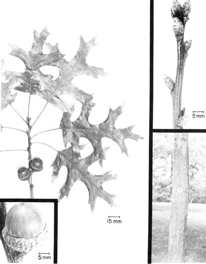 Bark dark grayish-black, divided into irregular fissures and scaly ridges. Branches stout, spreading to ascending. Twigs 3 to 4 mm in diameter, reddish, turning a dull red. Buds ovoid, acute, 5 to 7 mm long, covered with rounded, lightly pubescent scales. Leaves alternate, deciduous, simple; glabrous, except in axils of main veins on underside, oval to slightly obovate, 8 to 17 cm long, 5 to 13 cm wide, with 5 to 9 deep lobes often terminated by secondary lobes with bristle tips, sinuses usually deep, round, and wider than lobes; both surfaces pale green, upper surface shiny, bright scarlet in autumn, petioles about 4 cm long. Flowers unisexual; staminate in catkins with developing leaves; pistillate on pubescent peduncles. Fruit an acorn; cup 15 to 30 mm wide, covered with brown scales enclosing about one-third to one-half of the nut; nut ovoid, 10 to 20 mm long, occasionally with ring grooves near apical point at maturity.