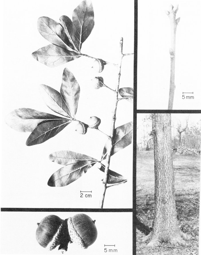 Bark nearly black, divided into broad flat ridges by deep fissures. Twigs 2 to 3 mm in diameter, usually reddish brown. Buds ovoid, reddish brown, 2 to 4 mm long. Leaves alternate, semi-deciduous, simple, a few shed in fall, a few persisting until spring; elliptic to spatulate, 7 to 15 cm long, 2 to 4 cm wide; apex acute or obtuse, margin entire, base cuneate; shiny green above, paler below; petioles 3 to 5 mm long, midrib conspicuous on underside. Flowers unisexual; staminate in catkins as leaves unfold; pistillate on twigs at leaf scars. Fruit an acorn, sessile to subsessile, cup 15 to 20 mm wide, enclosing about one-fourth of nut; nut hemispheric, rounded at apex and flattened at bottom, 15 mm long.