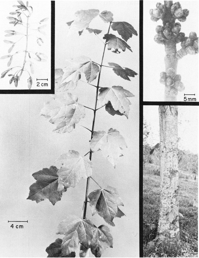 Red Maple, Acer rubrum L., has simple, opposite leaves that are usually glaucous and pubescent. The flowers appear in early February and the fruit is a double samara. The variety A. rubrum var. drummondii (Hook. and Arn.) Sarg., which has densely matted white hairs on the undersides of young leaves, grows in swamps throughout the South. Leaves may have three to five lobes, but southern trees are predominantly three-lobed. For this reason, some authors recognize the southern form as A. rubrum var. tridens Woods.