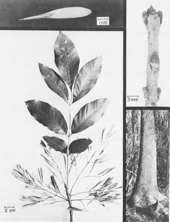 Two of the most common ashes are White Ash, Fraxinus americana L., and Green Ash, F. pennsylvanica Marsh. The most reliable distinction between the two species appears to be samara differences. White ash has a plump, short seed end with the wing practically terminal, whereas green ash has a slender seed end and the wing extends more than halfway down the seed end. White ash usually has a rounded leaflet base, but green ash has wedge-shaped leaflet bases. The undersurfaces of fresh white ash leaves are white, but the color is difficult to detect on dry specimens. Green ash leaves are green on both surfaces, although somewhat paler on undersurfaces.