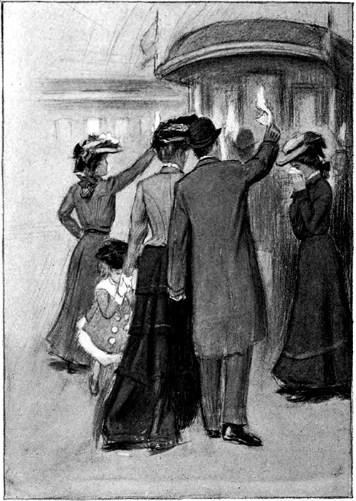 All the way during the last half of her two days’ journey—the first half being given up to longing for the beloved faces and little house which she had left behind—Janet had let her thoughts leap forward to the dear cousins, the aunt and uncle who were awaiting her. She was all ready to love them; she did love them, for they were her blessed mother’s kindred, who were so good to her in taking her into their hearts and home, in letting her share the wealth she knew they possessed, and in sharing one another with her. She knew the names and ages of each one of them; that Sydney was very handsome and Gwen very clever. All the Howes knew their Eastern cousins literally by heart,16 for they occupied in the minds of the little folk in the plain house in Crescendo a position something between an embodiment of perfect kinship and the princes and princesses of the fairy tales. And Janet knew and loved her Aunt Tina and her dearest Uncle Howard with positive worship, heightened, if possible, by their kindness to her in offering her this winter in New York. Her mother had talked to the children of her happy girlhood with her brother, until every little brook, every shaded path and meadow in the distant New Hampshire home, and every trick of voice and manner of this favorite brother Howard were as familiar to them as were their own lives and one another. Janet felt quite sure that when she descended upon the platform in the station and found all the Grahams drawn up in line to meet her, waving their hands and laughing—for that was the way the Howes always welcomed a stray guest to Crescendo—that she should be able to pick out each one with perfect accuracy. She should make no mistake as to which was Sydney, and which was Jack—she couldn’t very well, since there was nearly six years’ difference17 between them—nor which was Gwen and which Gladys, and quiet Viva, and dear little Geraldine, for whom she hungered most of all because she was precisely the age of her own precious youngest sister, her pet Poppet, as she called little Elizabeth. When she did descend upon the platform on the Jersey City side, a trifle sobered by the vastness of the station, the rush of the crowd, and the babel of sounds, there was no line of merry young faces anywhere in sight, no one that could be Uncle Howard or Aunt Tina, not even one who could be Sydney, Gwen, or Gladys. Janet caught her breath with a sharp pain, half fright, half bitter disappointment, and looked wildly around at the mad-appearing passengers, tearing through the chilly station with as frantic haste to catch the lumbering ferry-boat as if it had been as fast as a Bandersnatch.