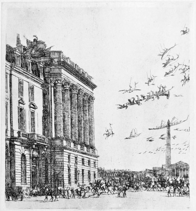 The only etchings of any importance that Meryon produced after his release from confinement are some of the last views of Paris, done at the time when he was retouching his old plates of Paris and making the, not very judicious, alterations which distinguish their latest states. The new ones are: Rue Pirouette (1860, plate 36), Tourelle de la rue de l’Ecole-de-Médecine (1861), which shows the house in which Marat was assassinated (plates 25, 26), Rue des Chantres (1862, plates 27, 28), Collège Henri IV (1864, plate 29), Bain-froid Chevrier (1864, plate 30), Le Ministère de la Marine (1866, plates 31, 32) and L’ancien Louvre, vers 1650 (1866, plate 38), in which, fulfilling a commission from the Chalcographie du Louvre, he returned to the study of his old love, Renier Zeeman. The Rue des Chantres is incomparably the finest of these, but it can only be seen to real advantage in the very rare early states, one of which the British Museum possesses (plate 27), in which the spire, a recent addition to Notre-Dame designed by Viollet-le-Duc, soars into an empty sky, which was after{23}wards disfigured by the incongruous insertion of two bells and a device with the initials J. B. (plate 28). The streets of all the etchings of the sixties are filled with excited crowds or little groups of tall, unnatural looking people, and all kinds of curious monsters and allegorical figures hover in the sky or swoop in rapid flight across it. The Collège Henri IV (plate 29) in some of its states, has for background a sea with sails and whales and sea-gods, and the figures in the foreground are the most extraordinary that Meryon ever drew.