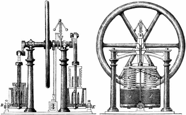Soon after his arrival at London, in the summer of 1848, through a firm which he knew from an earlier[9] period of his life, Hjorth made the acquaintance of a nephew of Bramah, the renowned mechanician and inventor of the Bramah-lock. Hjorth’s invention was then laid before a friend of Bramah’s, a civil engineer named Gregory, who had made the study of magnetism his specialty. Gregory at once persuaded Bramah to bear the expense of making a machine, and of securing patents in England and several other countries, on condition that the expected profits should be divided between him and Hjorth. Later on, B. Taylor and Normann Innis were taken in as partners, paying together £1000, and then Charles Stovin (£600) and Robert Broad, of the Henley Iron Works (£500). Two machines were now made, according to Hjorth’s directions, by the firm of Robinson & Sons, Pimlico, London. One of these is shown in Fig. 1, and is apparently quite an ingenious imitation of the steam-engines of those days. C is a movable, A a fixed electro-magnet. Their peculiar shape, involving several conical pins fitting into corresponding cavities, was thought to be advantageous for the distribution of the[10] effect of the magnetic force over a longer stroke. The »piston« C, reciprocating up and down, drives a crank shaft having two opposite cranks. To either of the cranks there is a corresponding group of magnets. An eccentric fixed on the shaft, moves a »slide valve«, alternately closing the circuit of one or the other of the two groups of magnets. When the one piston is at its lowest position, the circuit of the other group of magnets is closed, and its piston is attracted, until it reaches its bottom position; then the current is shifted, and the other piston attracted, etc. In order to avoid the formation of sparks at the circuit breaker, an ingenious device was provided, closing the current of one group of magnets, immediately before that of the other one was broken. The first machine was made with a 4 inch stroke, the next one with 13 1/2 inch stroke. The magnetic attraction per square inch of the piston, had about the same magnitude as the pressure per square inch in the low pressure steam-engines of those days. The patent application was filed in London as early as in October 1848, and it was granted on the 26th of April 1849[2]. On the 21st of September, the same year, Hjorth obtained a fifteen year monopoly in the kingdom of Denmark, to manufacture machines, utilizing electro-magnetism as motive power in the above described manner.