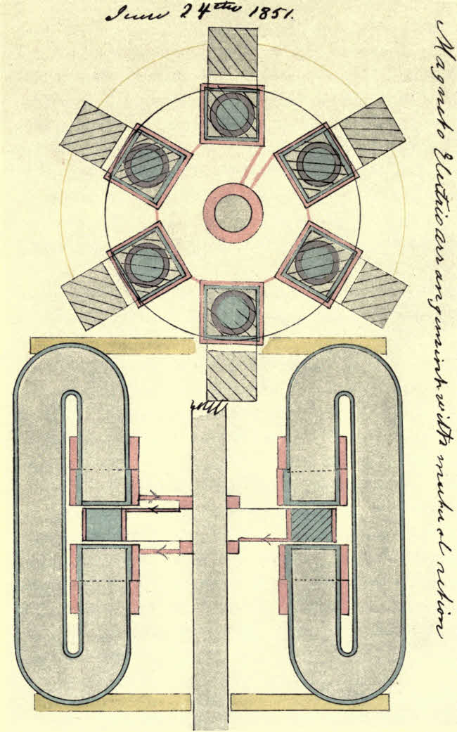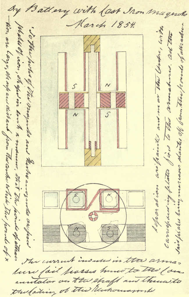 [3] After the publication of my first treatise in the »Elektroteknikeren«, for February 1907, various parties have objected that Hjorth, in his dynamos, did not use the dynamo principle in its purest form, as he had one large, unwound, cast iron magnet. On the contrary, the above-mentioned leaf of his sketch-book shows that Hjorth, as early as in 1851, has used the dynamo principle in its purest from—exactly the same as used by Siemens in 1867—as all the field magnets have been wound cast iron magnets, and the initial current is induced by the remnant magnetism of these magnets. S. S.