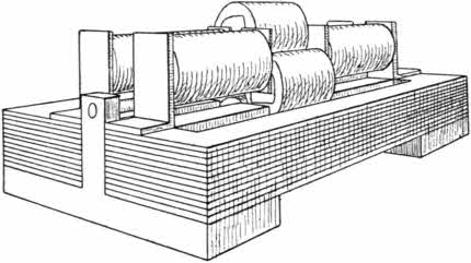 In 1853 Hjorth negotiated with a certain Dr. Watson, who had constructed a »dry battery« by means of which Hjorth had meant to drive his electro-magnetic machine. The object of their negotiations was to buy out Hjorth’s above-named partners, and to form a new company for the purpose of exploiting the above-mentioned two machines. The partnership, however, was not realized, and in spring of 1854, Hjorth himself commenced to have a 3 HP battery built in Copenhagen. The machine was fitted with cast iron magnets, and in all probability it was similar to the project of March 1854, and agreed with the patent of October, the same year.