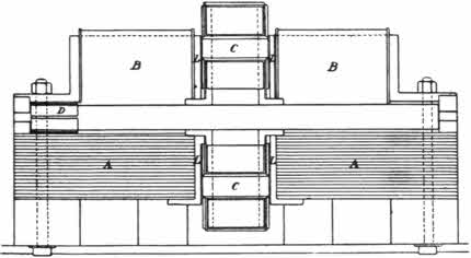 This patent specification reads as follows: »The main feature of this battery consists in applying one, two, or several permanent magnets A, of cast iron, and shaped as shewn in the drawing (Figs. 4 and 5), in connection with an equal number or more electro-magnets B, shaped as indicated[15] in drawing, in such a manner that the currents induced in the coils of the revolving armatures are allowed to pass round the electro-magnets; consequently, the more the electro-magnets are excited in the said manner, the more will the armatures C be excited, and the more electricity of course induced in the respective coilings; and while a mutual and accelerating force is produced in this manner between the electro-magnets and the armatures, an additional or secondary current is at the same time induced in the coiling of the electro-magnets by the motion of the armatures, the said current flowing in the same direction as that of the primary current, after having passed the commutator. The direction of the[16] current induced in the coils of the armatures will, of course, be reversed according to the change of the respective polarities, and the commutator D is therefore applied for the purpose of causing the current to flow constantly in one direction«. Then follows a description of the commutator of the dynamo. Finally the pole-shoes, or false poles, provided on the magnets as well as on the armatures, are mentioned. He points out that the false poles have on the side of attraction, a long straight edge, as distant from the centre as possible, while on the side of separation, either one has a sharp point, nearer to the axis of revolution, »all with a view to avoid reactionary currents, and at the same time to facilitate the motion of the armature«. »While steel magnets also may be applied instead of cast-iron magnets, the permanent magnets may be coiled like the electro-magnets, which also will serve to make them more permanent«.
