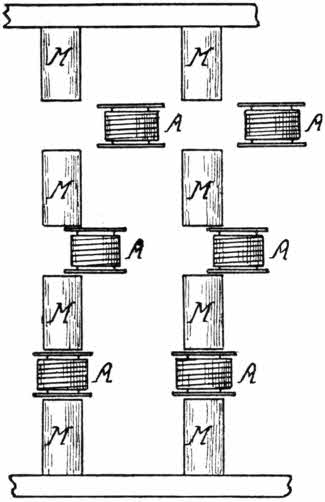 As previously mentioned, Hjorth had been disappointed in his attempts to produce energy through an electrical transmission of power, but this did not cause him to relinquish the idea of producing energy by electric means. He took this up again in a new form in his old age. In order to have this idea carried out in practice, Hjorth had a machine built, a description and drawing of which is to be found in a pamphlet published later on in French and Danish. From this it appears that the machine was not originally built according to the dynamo principle. Hjorth found no advantage in using the expensive[24] electro-magnets, as it was his main object to prove that, by his special arrangement of armatures and magnets, he could reduce the power required to produce a certain amount of electrical energy. The machine, in its manner of construction, reminds one to some extent, of Hjorth’s project of 1851. Two or three rings, or wheels, of armature coils A (see Fig. 7) revolve between three or four circular rows of magnets M. This decreased consumption of power was to be attained by offsetting the armature wheels somewhat relatively to one another, for instance so that when one armature of the topmost wheel was opposite one magnet pole, an armature of the next armature wheel would be spaced one quarter of a pole distance from a pole, and an armature of the lowest wheel would be one half pole distance from a pole. As it is well known, this idea is entirely erroneous, it being contrary to the axiom of the constancy of energy.