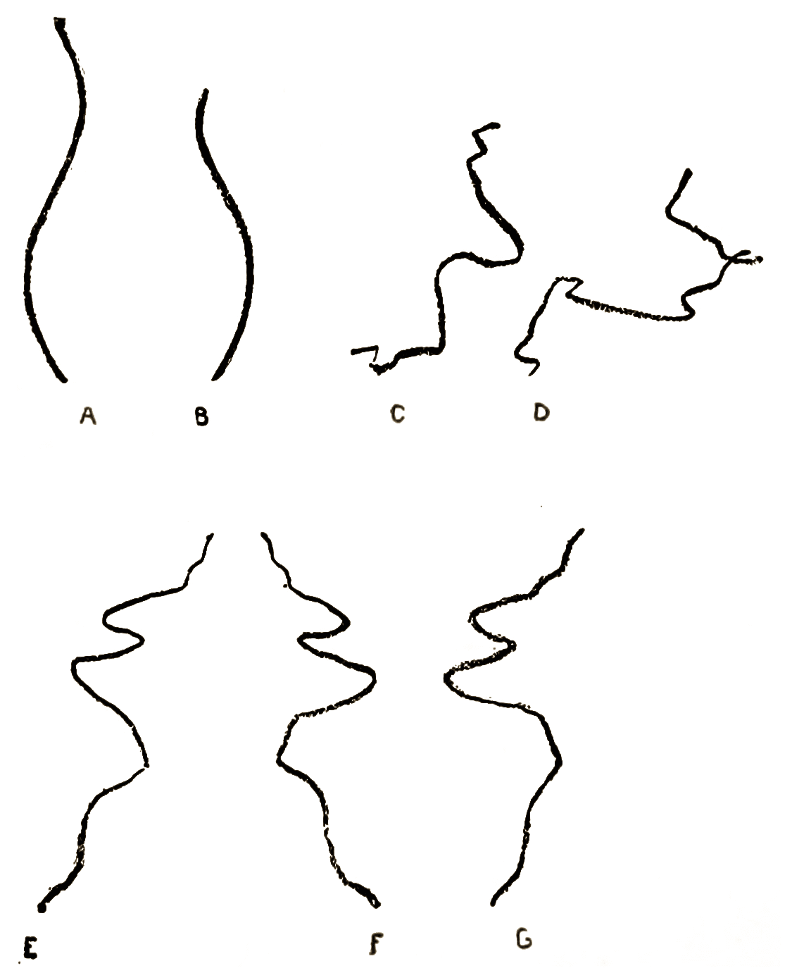 A similar experience of emotion comes to us a few181 minutes later in the same play when Cesare carries off the heroine from her bedchamber. This scene reveals a broad sea of billowy linen, evidently a bed, yet large enough for a whole bevy of heroines. Cesare appears outside a window, which seems to crumble at his touch. He enters the chamber and, dagger in hand, reaches out toward the head of the sleeping lady. We gasp at her fate, because we forget that this is only a play. That gasp is an expression of pity, a familiar emotion. But a mysterious emotion is in store for us. Cesare is spellbound by the lady’s beauty. He drops his dagger. Then suddenly he gathers her up, and, holding her against the side of his body, starts for the window. As he does so a sudden striking pattern is produced by the movement. In his haste Cesare has caught up some of the bed linen along with his prey, and this white expanse darts after him in a sudden inward-rushing movement from the remote corners of the bed. Instantly a strange sensation shoots through us. This sharp emotion, both painful and pleasing, is not pity, or hate, or fear. It does not relate itself to the villain’s violence against an innocent, defenseless girl. It is merely a “queer feeling” caused by that striking motion-pattern of the snowy linen whisked unexpectedly from the bed.