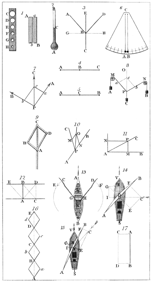 | Motion and Pressure.—Force.—Attraction.—Parallelogram of Forces.—Resultant.—Components.—Composition of Force.—Resolution of Force.—Illustrative Experiments.—Composition of Pressures.—Theorems regulating Pressures also regulate Motion.—Examples.—Resolution of Motion.—Forces in Equilibrium.—Composition of Motion and Pressure.—Illustrations.—Boat in a Current.—Motions of Fishes.—Flight of Birds.—Sails of a Vessel.—Tacking.—Equestrian Feats.—Absolute and relative Motion. | |