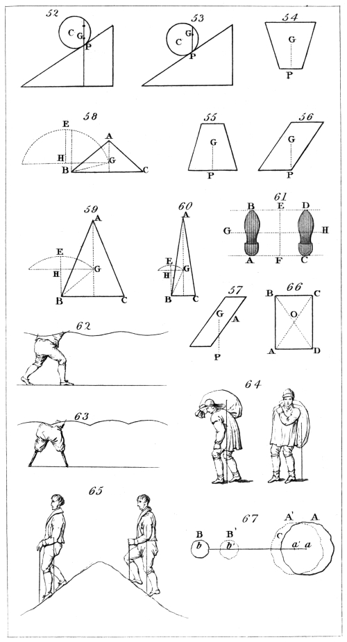 | Terrestrial Attraction the combined Action of parallel Forces.—Single equivalent Force.—Examples.—Method of finding the Centre ofvii Gravity.—Line of Direction.—Globe.—Oblate Spheroid.—Prolate Spheroid.—Cube. —Straight Wand.—Flat Plate.—Triangular Plate.—Centre of Gravity not always within the Body.—A Ring.—Experiments.—Stable, instable, and neutral Equilibrium. —Motion and Position of the Arms and Feet.—Effect of the Knee-Joint.—Positions of a Dancer.—Porter under a Load.—Motion of a Quadruped.—Rope Dancing.—Centre of Gravity of two Bodies separated from each other.—Mathematical and experimental Examples. —The Conservation of the Motion of the Centre of Gravity.—Solar System.—Centre of Gravity sometimes called Centre of Inertia. | |