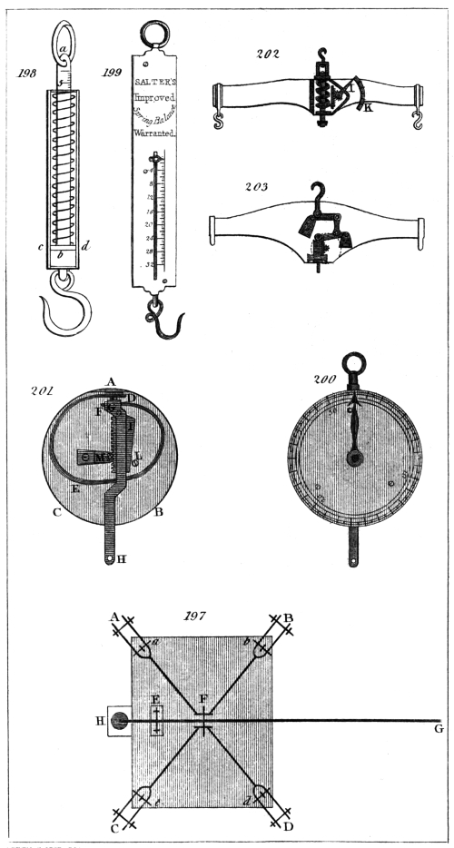 | Weight.—Time.—The Balance.—Fulcrum.—Centre of Gravity of.—Sensibility of.—Positions of the Fulcrum.—Beam variously constructed.—Troughton’s Balance.—Robinson’s Balance.—Kater’s Balance.—Method of adjusting a Balance.—Use of it.—Precautions necessary.—Of Weights.—Adjustment of.—Dr. Black’s Balance.—Steelyard.—Roman Statera or Steelyard.—Convenience of.—C. Paul’s Steelyard.—Chinese Steel-yard.—Danish Balance.—Bent Lever Balance.—Brady’s Balance.—Weighing Machine for Turnpike Roads.—Instruments for Weighing by means of a Spring.—Spring Steelyard.—Salter’s Spring Balance.—Marriott’s Dial Weighing Machine.—Dynamometer.—Compensation Pendulums.—Barton’s Gridiron Pendulum.—Table of linear Expansion.—Second Table.—Harrison’s Pendulum.—Troughton’s Pendulum.—Benzenberg’s Pendulum.—Ward’s Compensation Pendulum.—Compensation Tube of Julien le Roy.—Deparcieux’s Compensation.—Kater’s Pendulum.—Reed’s Pendulum.—Ellicott’s Pendulum.—Mercurial Pendulum.—Graham’s Pendulum.—Compensation Pendulum of Wood and Lead.—Smeaton’s Pendulum.—Brown’s Mode of Adjustment. |