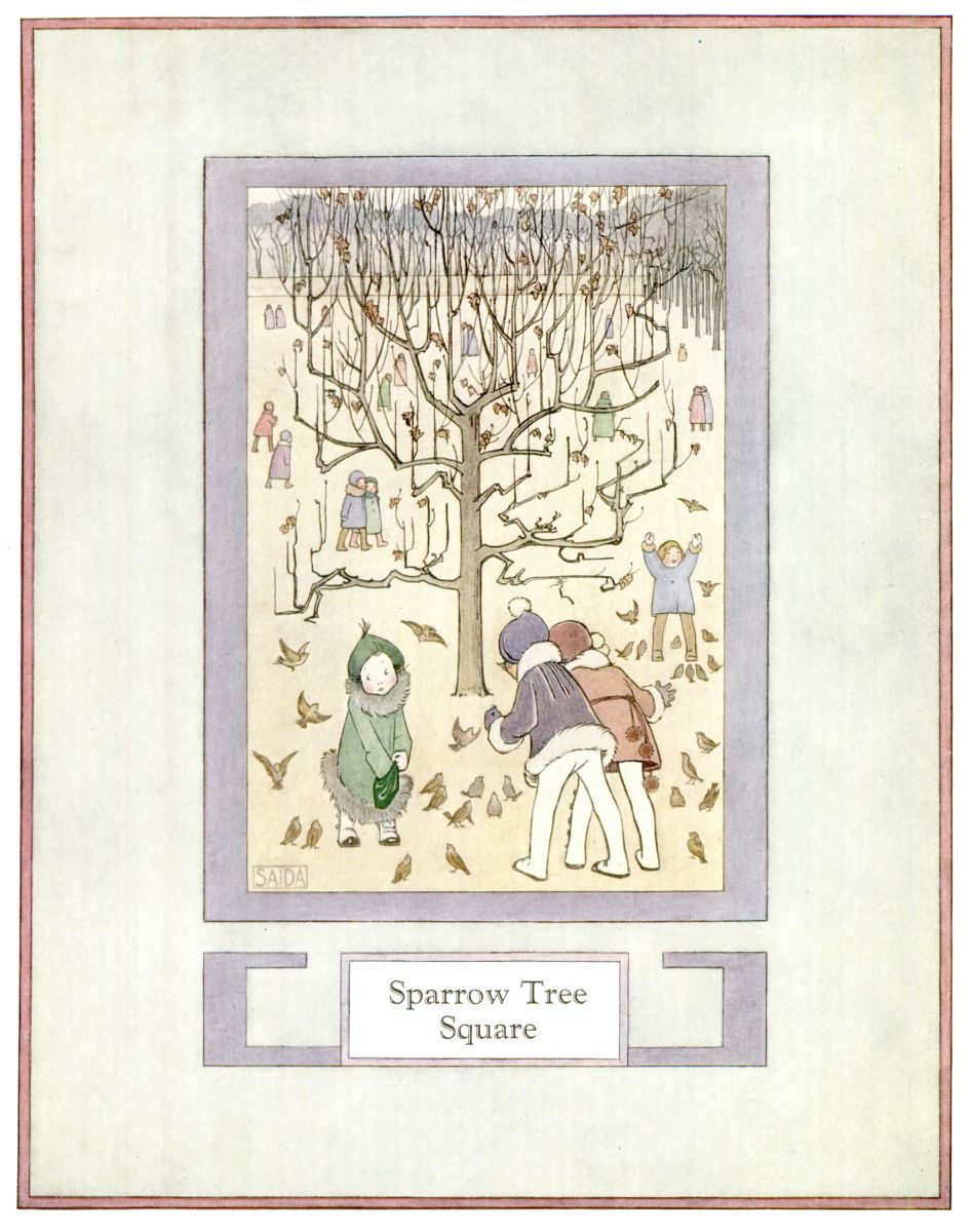 I am telling you all this because I want you to understand how proud she felt on that first morning when she took herself to Sparrow Tree Square to feed the birds. There were other children there, but they had nurses with them. Sometimes the children ran away and pretended they didn’t belong to the nurses and sometimes the{22} nurses lagged behind and pretended they didn’t belong to the children, but Diana Fitzpatrick Mauleverer James knew! She was the only entirely-all-by-herself person there. And she had given herself a bag full of bread-crusts to feed the sparrows with, and she had let herself wear the green coat with fur trimmings, and she was utterly and entirely happy. She nodded to William and Wilhelmina Good, who were walking up and down in a very correct way, William in green, too, and Wilhelmina, who had been growing rather quickly lately, in blue. She laughed like anything at a little boy who was trying to count the sparrows, and kept making it thirty instead of thirty-one, because one of them hid between his legs. How angry he was because he couldn’t make it thirty-one! Silly little boy! She bowed politely to the Vanderdecken girls—over-dressed as{23} usual—and agreed with them that it was a fine morning. They were feeding the sparrows, too, but they just had little bits of bread which their nurses gave them out of their pockets. Not like Diana, who had her crusts in a real grown-up bag!