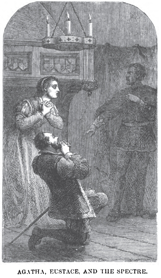On entering, he found himself in a cottage of a more respectable interior than from its outward appearance he had been led to expect: but he had little leisure or inclination for the survey of its effects, for his senses and imagination were immediately and entirely occupied by the scene which presented itself on his entrance. In the centre of the room into which he had been so readily admitted, stood, on its tressels, an open coffin; lights were at its head and foot, and on each side sat many persons of both sexes, who p. 32appeared to be engaged in the customary ceremony of watching the corse previous to its interment in the morning. There were many who appeared to the stranger to be watchers, but there were but two who, in his eye, bore the appearance of mourners, and they had faces of grief which spoke too plainly of the anguish that was mingling within: one, at the foot of the coffin, was a pale youth just blooming into manhood, who covered his dewy eyes with trembling fingers that ill concealed the tears which trickled down his wan cheeks beneath: the other—; but why should we again describe that still unbowed and lofty form? The awful marble brow upon which the stranger gazed, was that of Ruth Tudor.