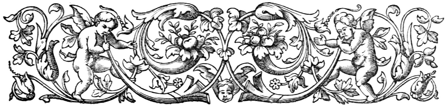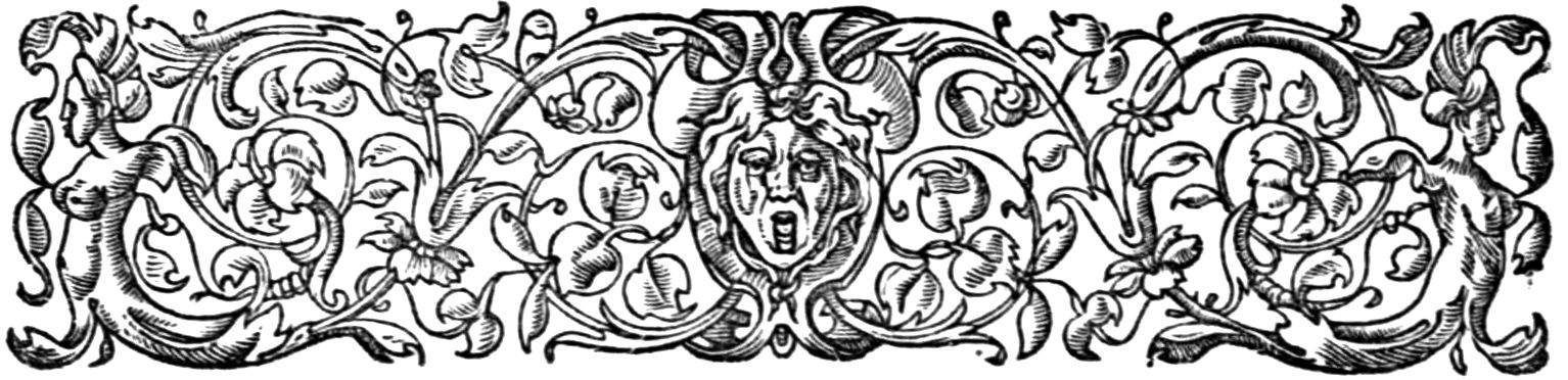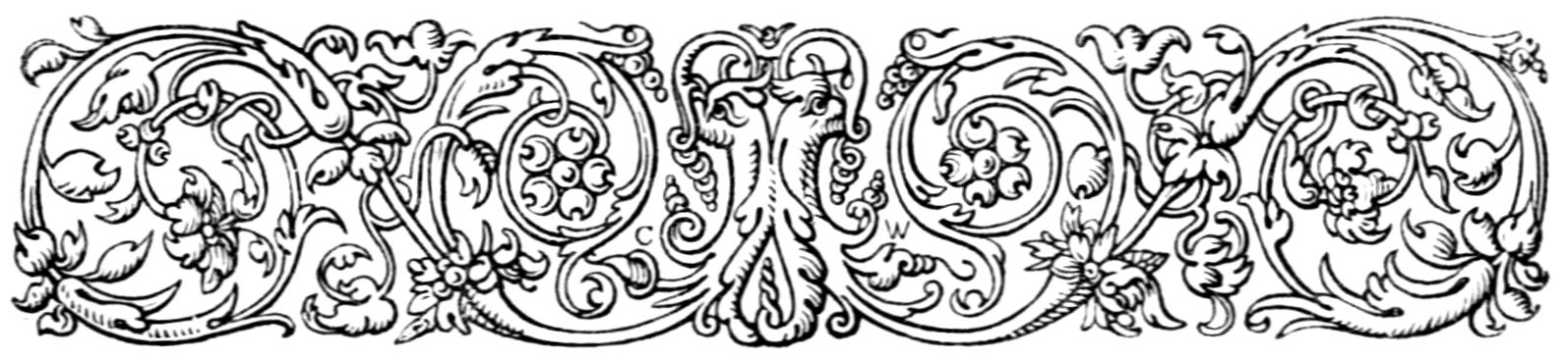 On the lower band, standing one at each side of a short pedestal, or rather low dado, are, back to back, two bearded grotesques, each of which is made up of a human head and face having three goats’ horns growing out of the forehead, and of a wyvern’s body, holding aloft in one of its claws a tall tapering torch. Further on comes a series of spaces peopled with emblematic personages, and separated from one another by two little naked winged boys standing on a highly elaborate zocle, and with the left hand swinging by a cord, at each end of which hang from a ring, and done up in bunches, fruits and flowers. In the first space is “Prudentia,” bearing in her right hand a long-handled convex mirror, in her left, a human skull; in the second space, upon a sort of throne, sits “Sollicitudo,” upholding in her right hand an oblong square time-piece, while on her left, with her elbow propped up by one arm of her chair, she leans her head as if buried in deep thought; in the third space sits “Animi-(Probitas)” with both her arms outstretched, as if reprovingly; in the fourth space we have “Ceres,” the heathen goddess of corn: crowned with a wreath of the centaurea flowers, she carries ears of wheat in her right hand, in her left, a round flat loaf of bread; in the fifth space, “Liberalitas,” who, from the emblems in her hands, must have been meant to personify not generosity but freedom, for in her right hand she shows us a hawk’s jesses, with the bells and their bewits, and on her left wrist, or, as it should be phrased, the “fist,” the hawk itself without jesses, bells, lunes, or tyrrits on—in fact quite free.