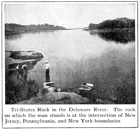 New Jersey lies between 73° 55′ and 75° 32′ west longitude and between 38° 56′ and 41° 21′ north latitude. Its northernmost point is marked by a rock on the shore of the Delaware River just south of Port Jervis, New York, known as Tri-States Rock. From this point to Cape May the length of the state is 166 miles. Its narrowest part, between Trenton and Raritan Bay, is 335 miles wide. Its widest part, measured on a line extending northwest from Great Egg Inlet, is 57 miles wide.