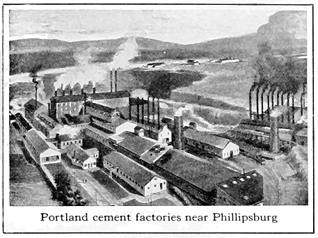 Lambertville, on the Delaware northeast of Trenton, is a prosperous town with considerable water power, whose principal industries are rock quarries, rubber works, and canning factories. Pennington and Hopewell in the interior are industrious canning centers. At Phillipsburg, on the Delaware, opposite the mouth of the Lehigh, five railroads meet. It is the western terminus of the Morris Canal. These transportation facilities make it a strongly industrial town. Its principal products are air compressors and rock drills, horseshoes, canisters, iron pipe, boilers, and silks. The principal cement works of the state are located near Phillipsburg. Belvidere, on the Delaware above Phillipsburg; Washington, Hackettstown, and Blairstown, in the interior, are popular residential towns. In Washington pianos and organs, and in Hackettstown saws and leather, are the chief industrial products. In Hackettstown and Blairstown well-known educational institutions are located. Newton is located in the picturesque mountain region of Sussex County. Here dairy farming is important. Its chief manufactures are shoes, silks, and dyeing.