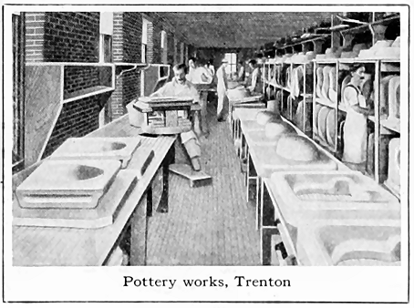 Trenton and the Towns of the Upper Delaware Valley.—Trenton, the capital of the state since 1790, was settled about 1679. Here occurred the Battle of Trenton, which is commemorated by an imposing monument. It is situated on the Delaware at the head of navigation. The Delaware and Raritan Canal passes through the city. It thus has the advantage of transportation by water and railway. The water power developed by the Falls of the Delaware encouraged the establishment and growth of the city's industries, but these have grown so extensive that they do not rely upon it. In the neighborhood of Trenton are deposits of clay which were the basis of the pottery industry. It has forty-eight potteries and in this industry it is rivaled by only one city in the United States. The local clay is now used very little. The better grades of pottery require the finer clays which are obtained from England, France, and some states of this country. It manufactures more sanitary earthenware than any other city in the country. Other extensive industries are automobile factories, iron and steel works, machine shops, foundries, rubber works, woolen mills, watch factories, and oilcloth and linoleum factories.