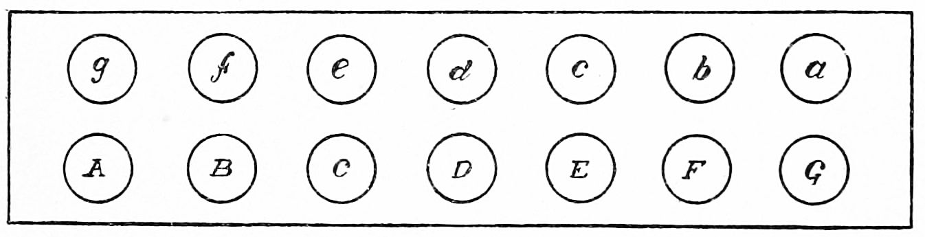 The visitor to the little Syrian colony in Washington street in New York City will often find two men intent upon this game. They call it Mancala. The implements are a board with two rows of cup-shaped depressions and a handful or so of pebbles or shells, which they transfer from one hole to another with much rapidity. A lad from Damascus described to me the methods of play. There are two principal ways, which depend upon the manner in which the pieces are distributed at the commencement of the game. Two persons always engage, and ninety-eight cowrie shells (wada) or pebbles (hajdar) are used. One game is called La’b madjnuni, or the “Crazy game.” The players seat themselves with the board placed lengthwise between them. One distributes the pieces in the fourteen holes, called bute, “houses,” not less than two being placed in one hole. This player then takes all the pieces from the hole at the right of his row, fig. 1, G, called el ras, “the head,” and drops them one at a time into the holes on the opposite side, commencing with a, b, c, and so on. If any remain after he has put one in each of the holes on the opposite side, he continues around on his own row A, B, C. When he has dropped his last piece he takes all the pieces in that hole and continues dropping them around as before. This is done until one of two things happens—his last piece drops into an empty hole, when he stops and his opponent plays, or it drops into a hole containing one or three pieces, completing two or four. In that case he takes the two or four pieces with those in the hole opposite, and if one or more of the holes that follow contains two or four without the intervention of a hole with any other number, he takes their contents with those opposite. The second player takes from the hole g, and distributes his pieces around A, B, C. If the head is empty, the player takes from the next nearest hole in his row. When the board is cleared, each player counts the number he has above his opponent as his gains. No skill is necessary or of any avail in this game, the result being a mathematical certainty, according to the manner in which the pieces were distributed in the beginning. La’b hakimi, the “Rational game,” or La’b akila, the “Intelligent game,” is so called in contrast to the preceding. Success in it depends largely upon the skill of the players. In this game it is customary in Syria to put seven pieces in each hole. The players, instead of first taking from the hole on their right, may select any hole on their side of the board as a starting place. They calculate the hole in which the last piece will fall, and the result depends largely upon this calculation. La’b rosëya is a variety of the first game and is played only by children. Seven cowries are placed in each hole, and the first player invariably wins. My Syrian friend told me that the shells used in the game are brought from the shores of the Red Sea. Mancala is a common game in Syrian cafés. Children frequently play the game in holes made in the ground when they have no board, a device also resorted to by travelers who meet by the way.