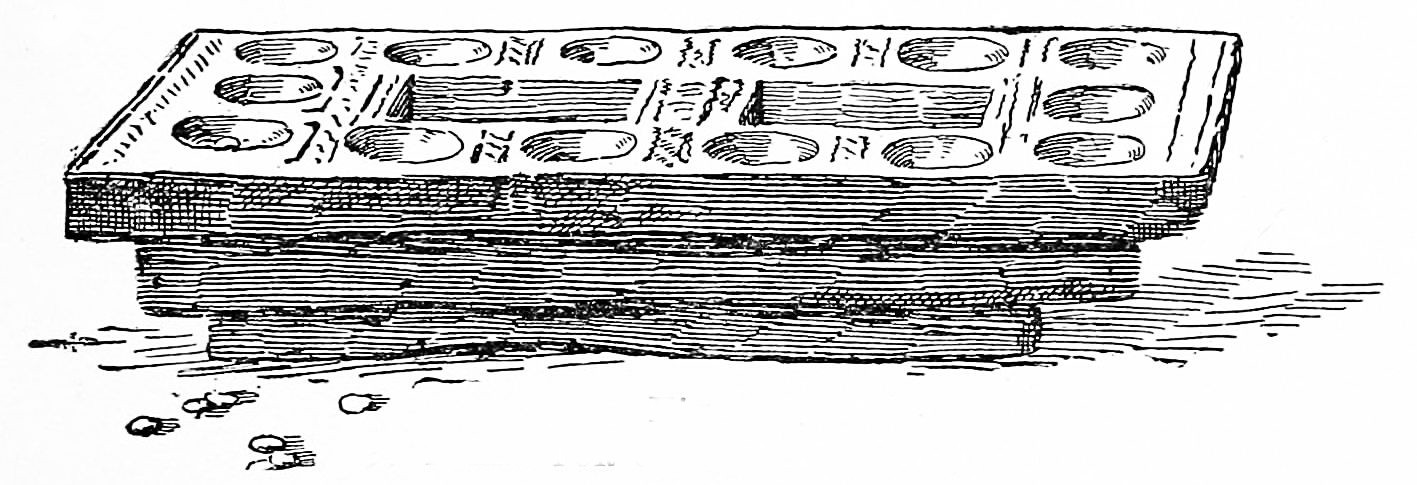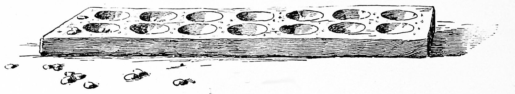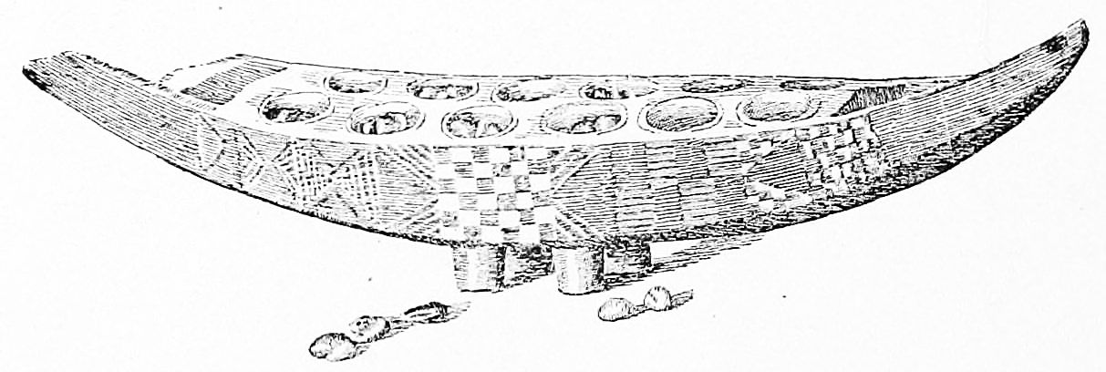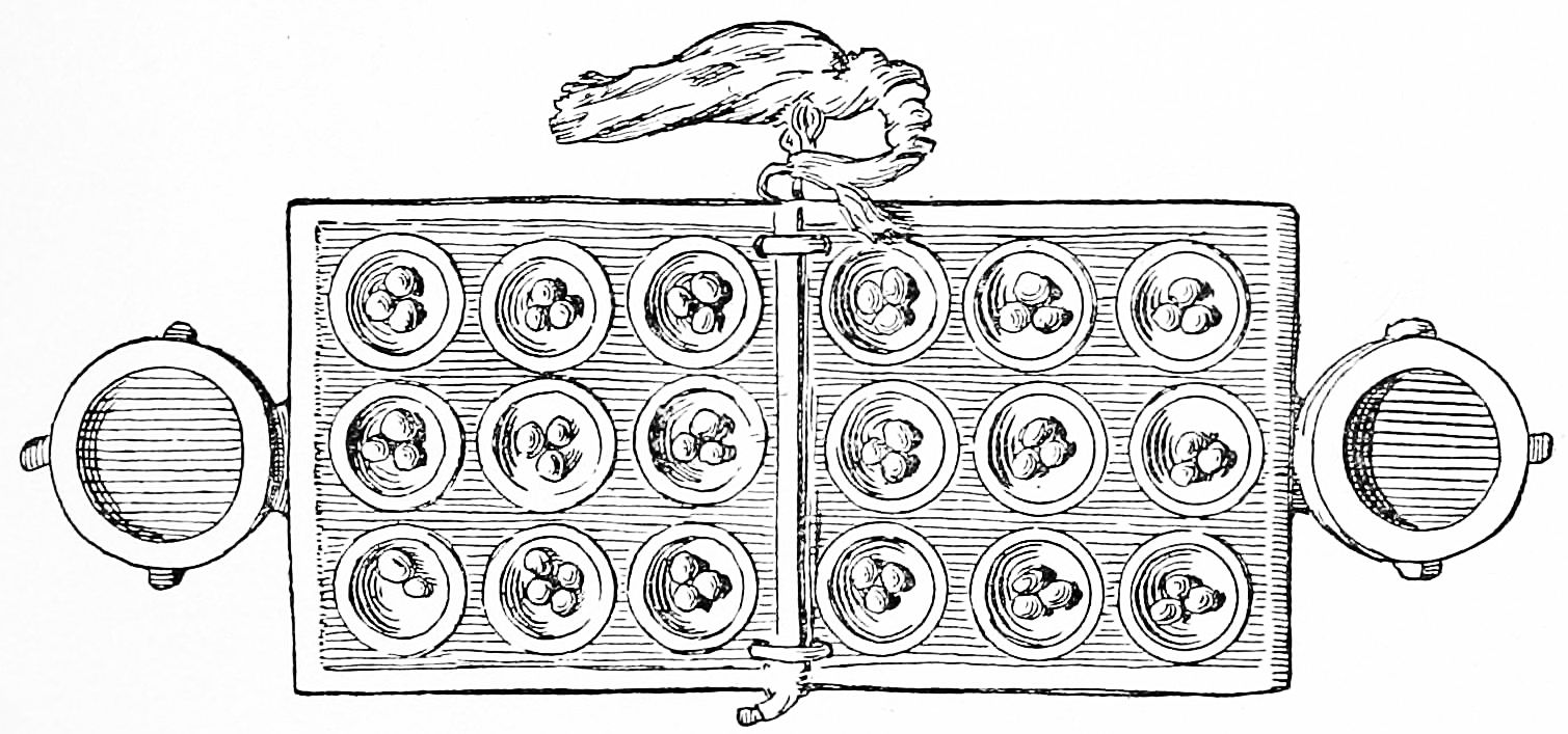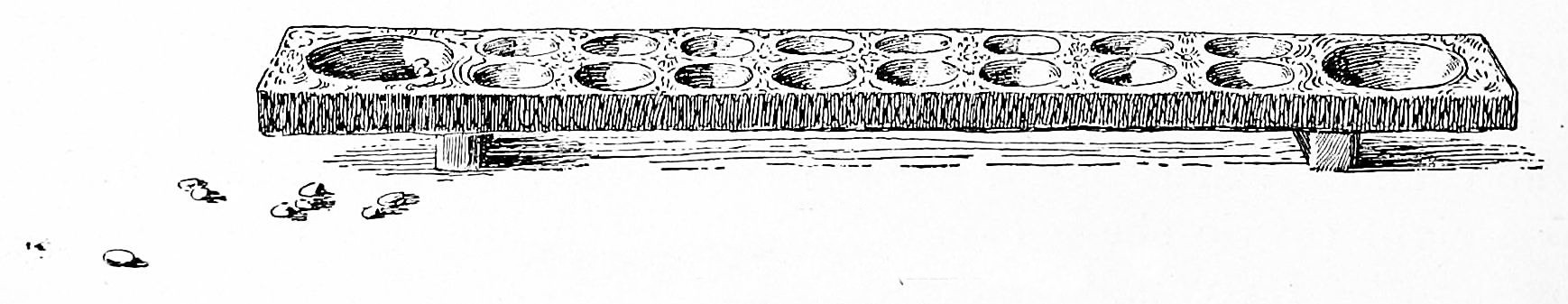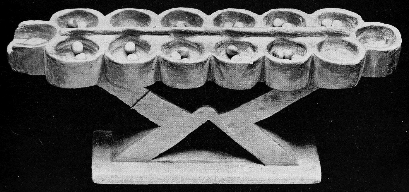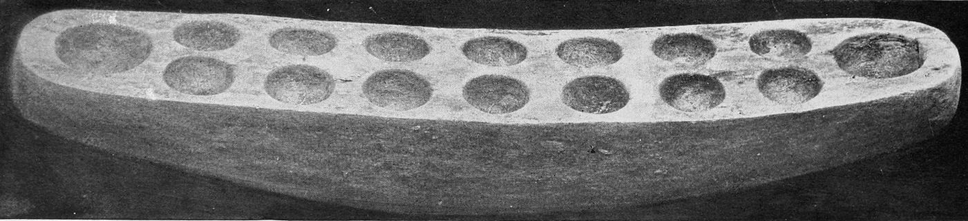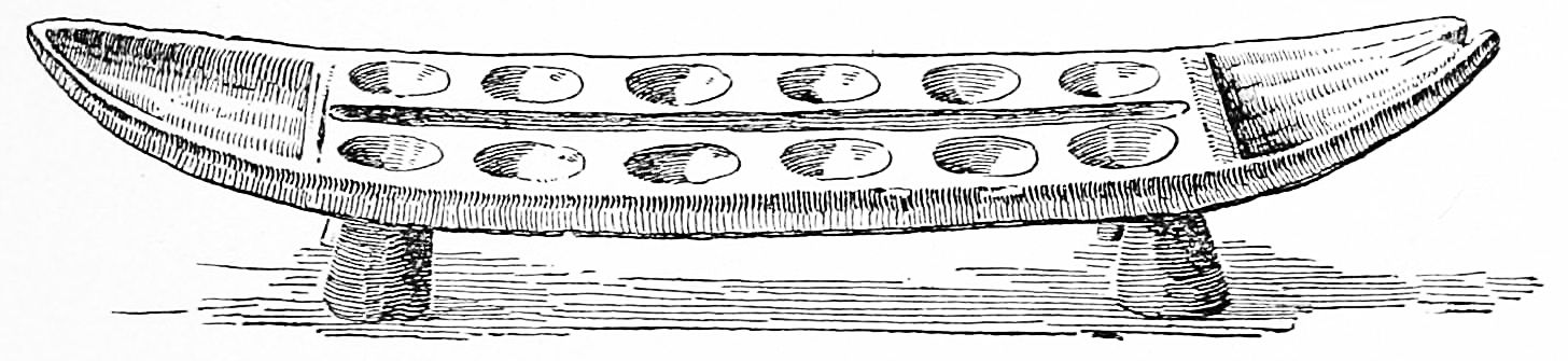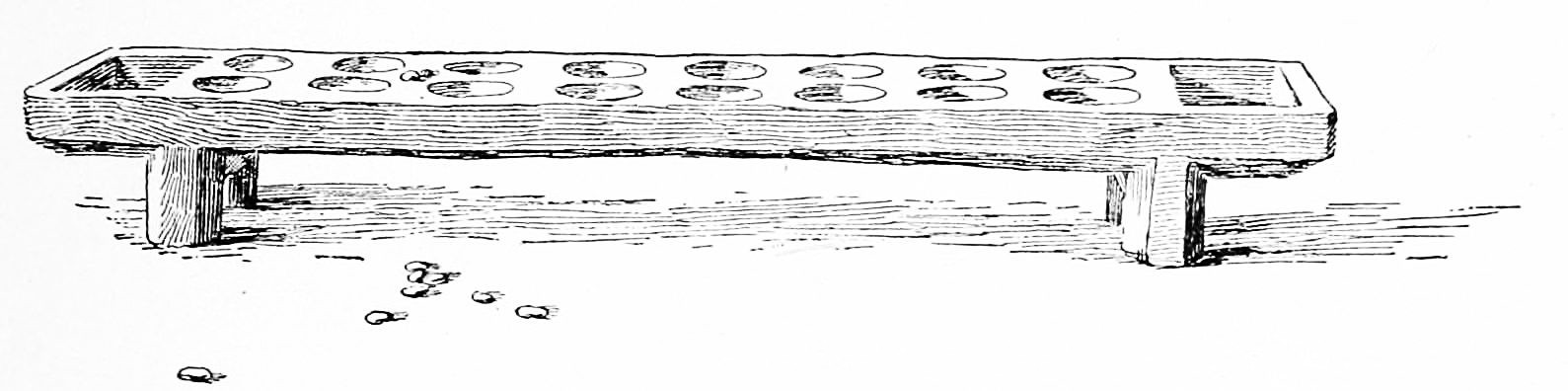 [4] The collector, Rev. A. C. Good, gives the following account of the game: “Two players seat themselves on opposite sides of the board, and four counters are placed in each of the twelve pockets. Then one player takes the counters out of a pocket on his own side and drops one in each pocket around as far as they will go, going to right and back on his opponents side in the opposite direction from that in which the hands of the clock move. They move thus alternately until one manages to make his last counter fall in a pocket on his opponent’s side, where there were only one or two counters. When he has done so he has won the counters in that pocket, including his own last counter. These he transfers to the receptacle in the end of the board to his right. A single counter taken from last pocket on player’s right can not win from opponent’s first pocket opposite, even though it contains only one or two counters. When a pocket has accumulated twelve or more counters, so that a player drops clear around and back to where he began, he must skip the pocket from which he started. When so few counters remain in the pocket on the board that no more can be won, the game is ended and each counts his winnings. The counters that remain in the board at the end of the game are not counted by either player. The game is sometimes varied thus: When a counter wins as above, not only the contents of that pocket is won, but of the pocket or pockets before it on the opponent’s side that has contained only one or two counters back until one is reached that has been empty or had three or more counters before the play. This last is rather the better game of the two. The Fans do not play these games skillfully. They seem unable to count ahead to see where the last count will fall. A white man, as soon as he understands the game, will beat them every time.”