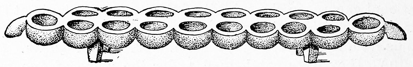 Chuba is an adaptation from a rude game of eastern Africa which is greatly enjoyed by the natives, who squat on the ground and play in holes scooped out of the sand, using shells, young cocoanuts, etc., for counters, which they move from hole to hole. As now presented to the civilized world for its diversion, Chuba is a game of skill for two players. It is made up of a board with 4 parallel rows of holes or pockets, 11 in each row, and 60 small beads used as men or counters. [See fig. 14.].