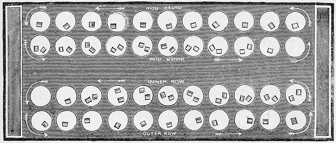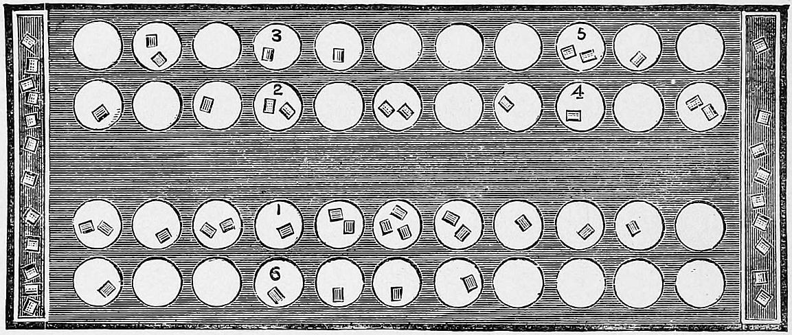 Before beginning the game each player places a single counter in each of the pockets of his outer row and two counters in each pocket of his inner row, except that the pocket on his extreme left in the inner row is kept vacant and the one next to it holds but one man. The above diagram shows the arrangement of the board at the opening of the game. As indicated by the arrows, all moves in the inner row are from right to left, and those in the outer row from left to right. As the players face each other the moves in the two inner rows are necessarily in opposite directions.