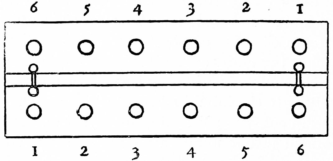 Suppose the player B had just finished a move by dropping a “last man” in No. 1. He can capture all the men in 2 and 3 by his skill and also in 4 and 5 or from any other two opposite pockets of his opponent’s inner and outer rows. Had 2 been vacant, however, he could not have taken any men. Had 3 been vacant, he could have taken the men from 2 and those from 4 and 5. Had his last man fallen in the outer row, in 6 for example, the effect would have been of no avail in capturing anything, because the outer row is always noncombatant.