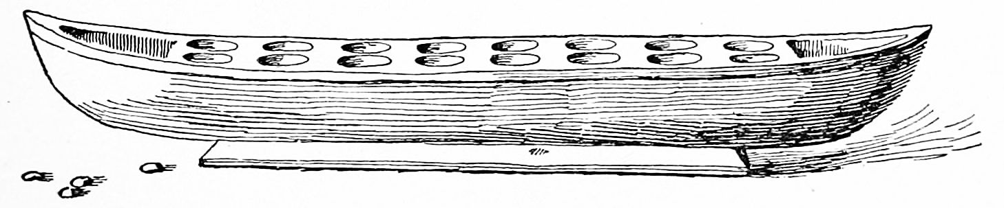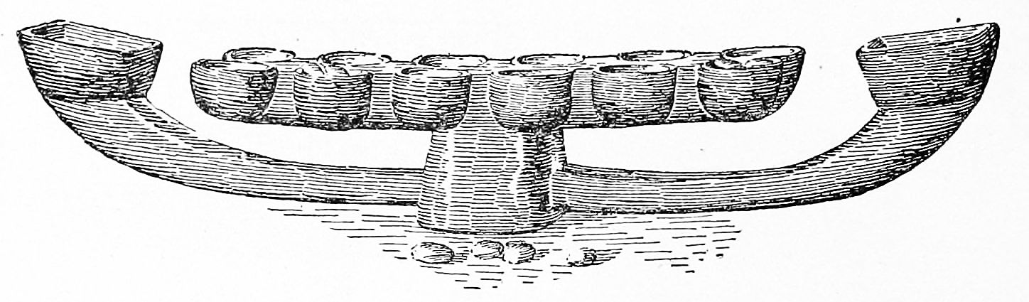 Dr. Thomas Hyde gave a very good account of it two hundred years ago in his treatise, “De Ludis Orientalibus” (see fig. 3), and Lane, in his “Manners and Customs of the Modern Egyptians,” describes it very fully as played in Cairo upon a board with twelve holes, quite in the manner I have related. Seventy-two shells or pebbles are there used, and, whether shells or pebbles, are indifferently called hasa. The hemispherical holes in the board are called buyoot, plural of beyt. The score of the game is sixty, and when the successive gains of a player amount to that sum he has won. I soon found that I had learned from my Syrian acquaintance nothing that had not been recorded, but upon visiting the Damascus House in the Turkish village at the Columbian Exposition at Chicago, I was enabled to engage with the Syrians in the game, and was impressed with the peculiar distribution of the game over the world. The Ceylon exhibit contained boards from the Maldives with sixteen holes in two parallel rows, with a large hole at either end. (Figs. 4 and 5.) Here the game is called Naranj. Boards in the same exhibit from Ceylon had fourteen holes with two large central cavities (fig. 6), the game being called Chanka. An Indian gentleman informed me that the game was common at Bombay. His Highness the Sultan of Johore exhibited a boat-shaped board with sixteen holes (fig. 7) under the name of Chongkak. I learned, too, that the game was common in Java, as well as in the Philippine Islands, where a boat-shaped board with sixteen holes is also used (pl. 2, fig. 2), the game being called Chungcajon. It would thus appear that the game extends along the entire coast of Asia as far as the Philippine Islands. Mancala and a kind of draughts were the favorite amusements of the negroes from the French settlement of Benin on the west coast of Africa in the so-called Dahomey village at the Columbian Fair. They played on a boat-shaped board, with twelve holes in two rows, which they called adjito, with pebbles, adji, the game itself being called Madji. It is with the continent of Africa that the game of Mancala seems most closely identified. It may be regarded, so to speak, as the African national game. In the exhibit of the State of Liberia at Chicago, there were no less than eleven boards, comprising three different forms, said to be from the Deys, Veys, Pesseh, Gedibo, and Queah. (Figs. 8, 9, and 10.) They were catalogued under the name of Poo, by which name the game is known to civilized Liberians. The game is, in fact, distributed among the African tribes from the east to the west and from the north to the south. In Nubia, where a board with sixteen holes is used, it is known as Mungala.