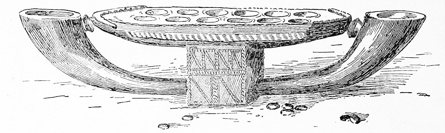 In the narrative of the Portuguese embassy of Alvarez to Abyssinia (1520-1527) reference is made to “Mancal” as an unknown game, antiquated in the reign of Don Manuel. Bent has recently described it as still existing in Abyssinia under the name of Gabattà.[2] (Fig. 11.) Dr. George Schweinfurth states that it is played by the Niam-Niam, and is constantly played by all the people of the entire Gazelle district, although perhaps not known to the Moubuttoo. The Niam-Niam call the board, which has sixteen cavities, with two at the end for the reception of the cowrie shells, Abangah, (fig. 12) and the Bongo name for the board is Toee. He also says that it is found among the Peulhs, the Foolahs, the Toloofs, and the Mandingos in the Senegal countries, who devote a great portion of their time to this amusement. Rohlfs found it among the Kadje, between the Tsad and the Benue.[3] It also occurs among the Biafren and the Kimbunda. Héli Chatelain, who lived for some time at Angola, described the game to me under the name Mbau, and said that cavities are cut in the rock for this game at the stations where the porters halt. A board collected by him at Elmina, now in the U. S. National Museum, Washington, D. C., has twelve holes in two rows, with large holes at the ends. (Pl. 3.)