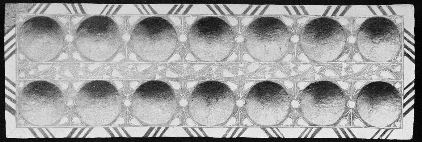 Among the Fans of the Gaboon River the game is called Kale,[4] after the bean-like seed used in counting. (Fig. 13 and pl. 4, fig. 1.) Another board in the U. S. National Museum, collected by that adventurous traveler, Dr. W. L. Abbott, from the Wa Chaga tribe at Mount Kilima-njaro, has twenty-six holes arranged in four rows of six each, with two large holes at the ends. (Pl. 4, fig. 2.) He describes it in his catalogue, published by the Smithsonian Institution, under the name of Óchi, used for playing Bau, a common game throughout Africa, and says that it is played with nicker seeds and pebbles. Bent, in his “Ruined Cities of Mashonaland,” gives the following account of the game: “Huge trees sheltered the entrance to their village, beneath which men were playing Isafuba, the mysterious game of the Makalangas, with sixty holes, in rows, in the ground. Ten men can play at this game, and it consists of removing bits of pottery or stone from one hole to another in an unaccountable manner. We watched it scores of times while in the country, and always gave it up as a bad job, deciding that it must be like draughts or chess learned by them from the former civilized race who dwelt here.” He then proceeds to identify Isafuba with the games of Wari played on the west coast of Africa.