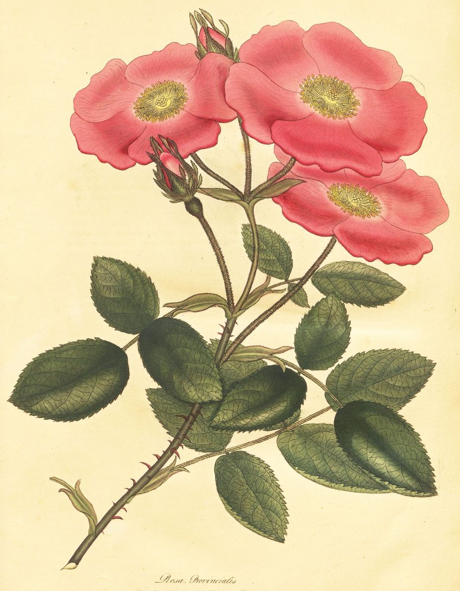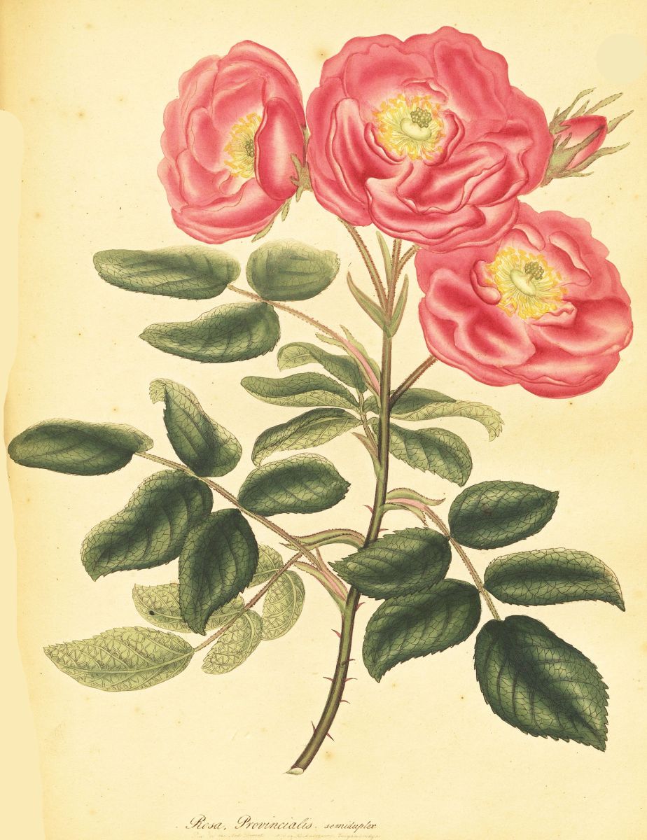 This variety of the Common Province is the most fragrant of all the Roses, and therefore particularly desirable; for, although it cannot be ranked among the rare, it is nevertheless one of the most beautiful. Its sweetness, joined to the abundance of its blossoms, has rendered it an object of culture, for the purpose of distillation; as it yields a much greater quantity of scented water than any other rose. It is generally denominated the Cabbage Province, from the extreme complexity of its petals, which sometimes adhere so closely together, as to prevent entirely their expansion without bursting:—a circumstance that frequently occurs in the vegetable from which its specific distinction is derived, and which we regard to be unequivocally good, as we should every similitude of equally easy reference. By the closeness and superabundance of its petals only, is it distinguished from the Common Province, of which it is certainly an interesting variety.{20}