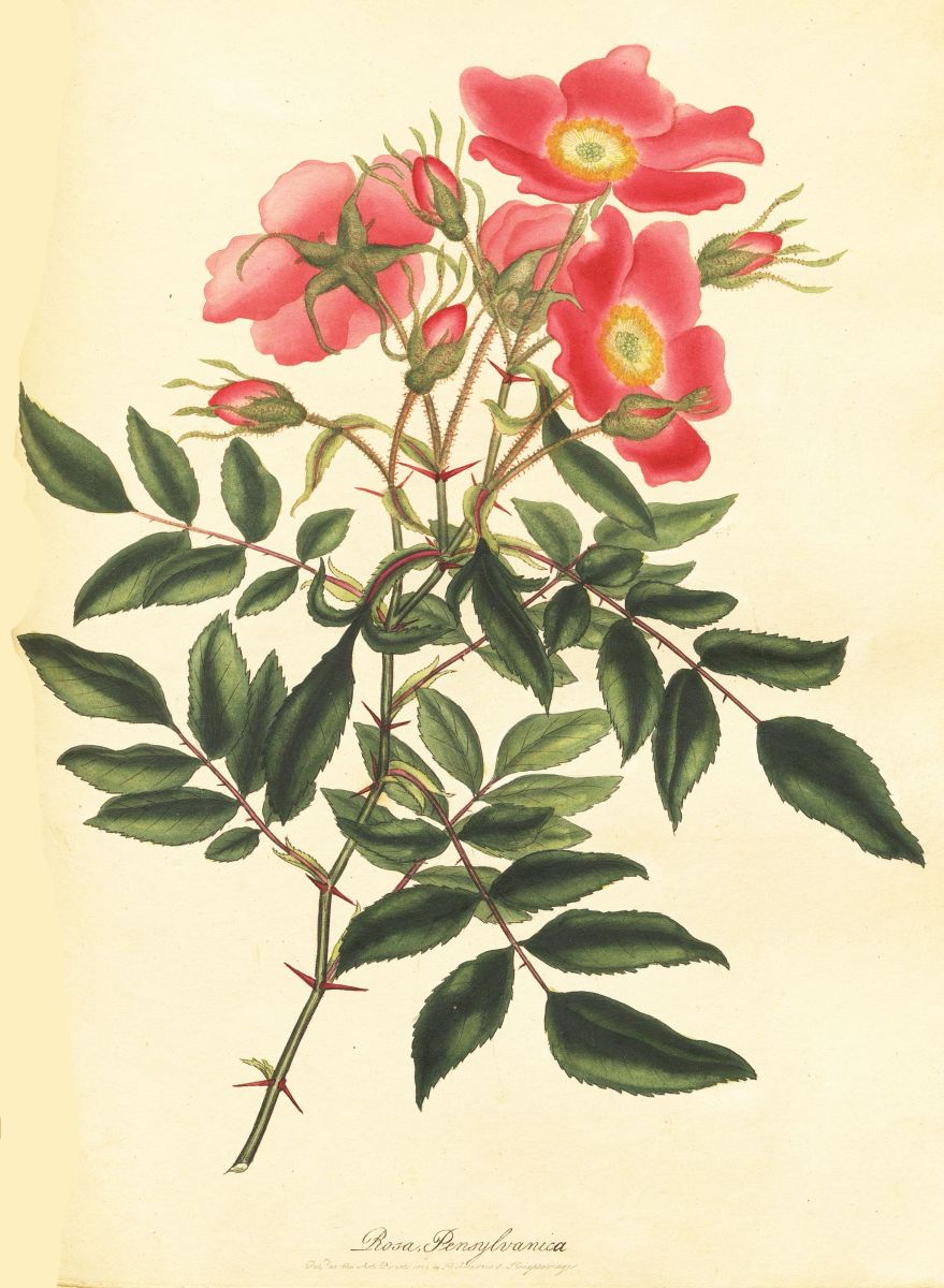 This new species of Sweetbriar, we are informed, was introduced from North America, about the year 1801, by Mr. Pope, a nurseryman near Birmingham. The foliage is small, neat, and regular, but not so fragrant as the leaves of the common Eglantine. The flowers are abundant, and of a fine pinky colour whilst in perfection, but grow paler when going out of bloom; in which state its size enlarges just before the petals fall off. It is increased by seed and layers; but as it does not at present seed freely, nor are the layers rapid in forming a root, it will most probably continue for some time as a scarce rose. Our drawing was made in the month of June, from a luxuriant plant in the nursery of Mr. Williams, at Turnham Green.{106}