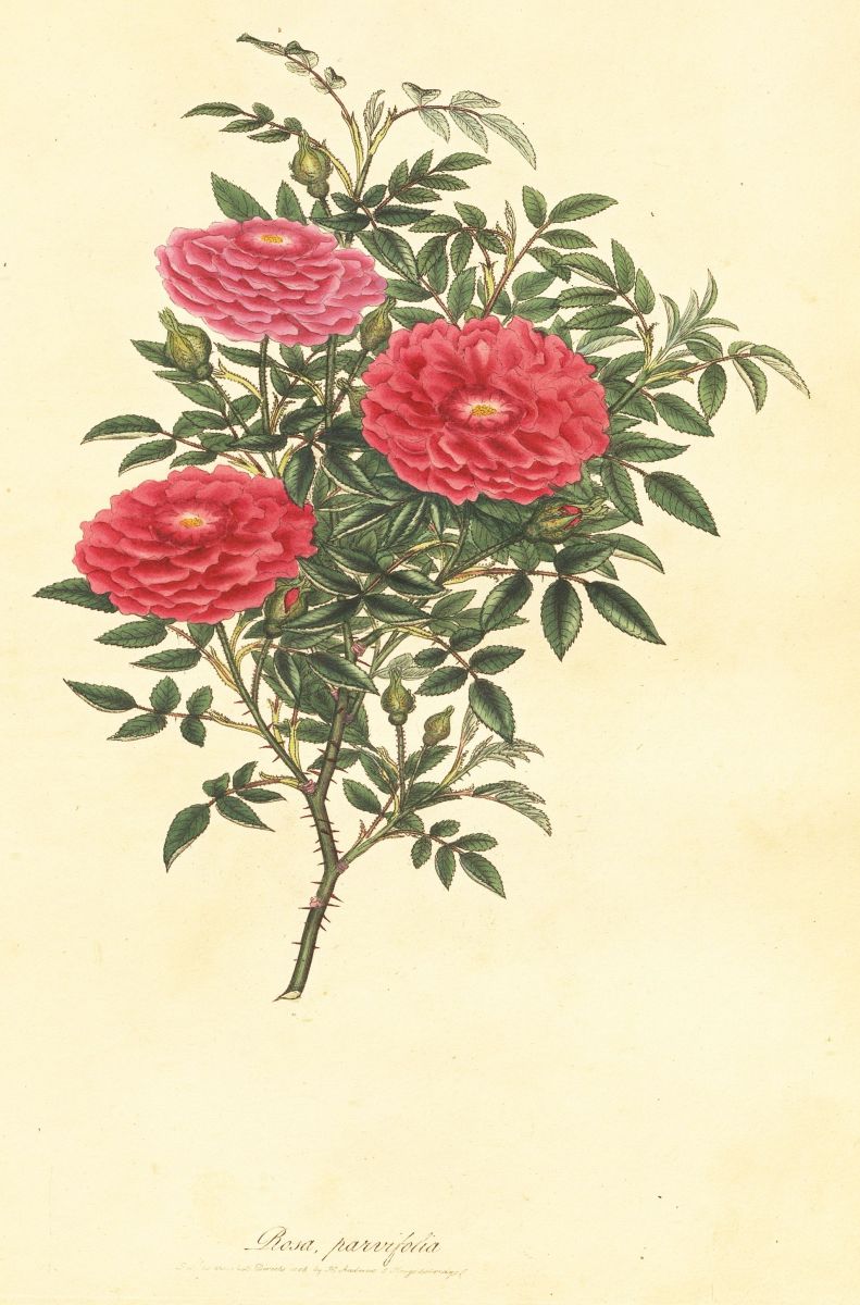This elegant minor variety of the Dwarf Rose has been, and still continues to be, regarded as superior to most, equal to any, and surpassed by no one, of this enchanting genus at present known. It is an evident variety of the Rose de Meaux, an equally beautiful Rose, but whose flowers are larger, and deficient in the fine deep red eye;—the principal specific distinction, in the present plant, and which is thought to give it a decided superiority. But whether this distinction be a permanent character, is certainly at present a matter of doubt; for in several instances we have seen it lose this central distinction, and attain the full height of its original. Yet against this observation we are acquainted with two exceptions: one of them, a plant in the nursery of Mr. Shailer; the other, a plant in the nursery of Messrs. Loddige; neither of these plants having for years grown beyond a foot in height, nor have the proprietors ever been able to propagate them. It is therefore not improbable, that upon comparing them with the present figure when in fine bloom, there may be found a sufficient distinction to enable us to subjoin another figure of it, under the title of minima, or smallest variety.