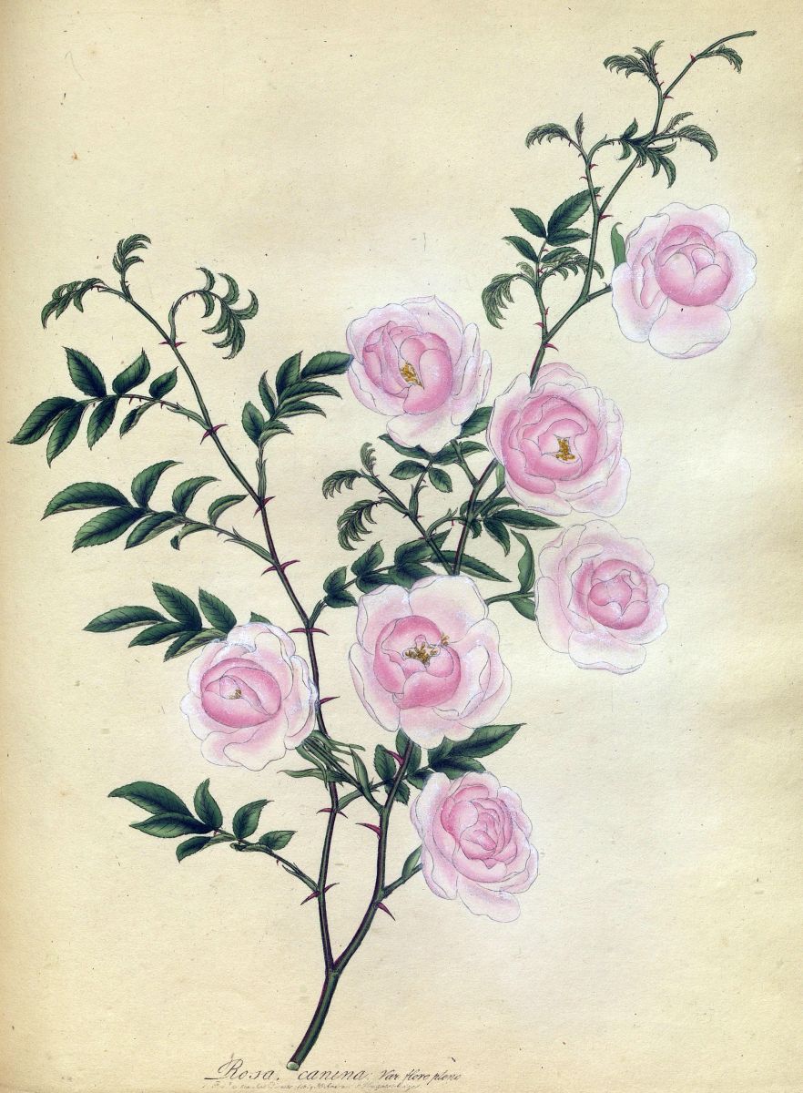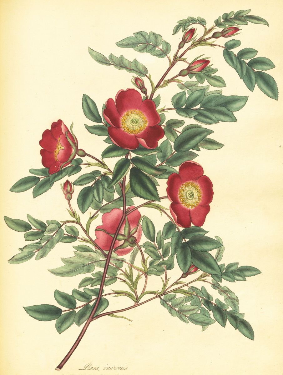 In the Hortus Kewensis we find this Rose described as having smooth seed-buds and an unarmed stem; and the very reverse character being the leading features by which our plant may at all times be discriminated, induced us at first to imagine it might be a different species: but finding upon inquiry amongst cultivators, that this Rose and no other is perfectly known by the appellations of Rosa blanda, Hudson’s Bay or Labradore Rose, we have therefore retained the name, but altered the description. It is a very lively-looking little rose, whose bloom is rather short in duration, but of quick succession, introduced to this country in the year 1773. Our drawing was made from plants in the nursery of Messrs. Loddige.{108}