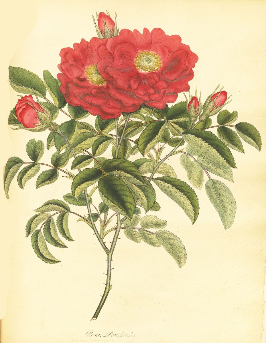 This Rose is perfectly well known under the appellation of the Portland Rose; a title it is said to have received in compliment to the late Duchess of Portland, a great admirer of this charming tribe of plants, and in whose collection at Bulstrode they were cultivated in great luxuriance. It is a fine scarlet Rose, of a most brilliant appearance, far above comparison with any effort of art. It appears to have the compound character of three different plants: in growth and flower, like the Gallica officinalis; in foliage, like the Province; with seed-buds and peduncles more resembling the Damask species. Yet with all these affinities it seems to possess a perfectly distinct character, and may be easily distinguished from most other Roses by the fiery colour of its flowers: the stalks are of a whiter green, and the foliage of a yellower green, than Roses in general. It continues in successive bloom from the middle of summer till late in autumn.
