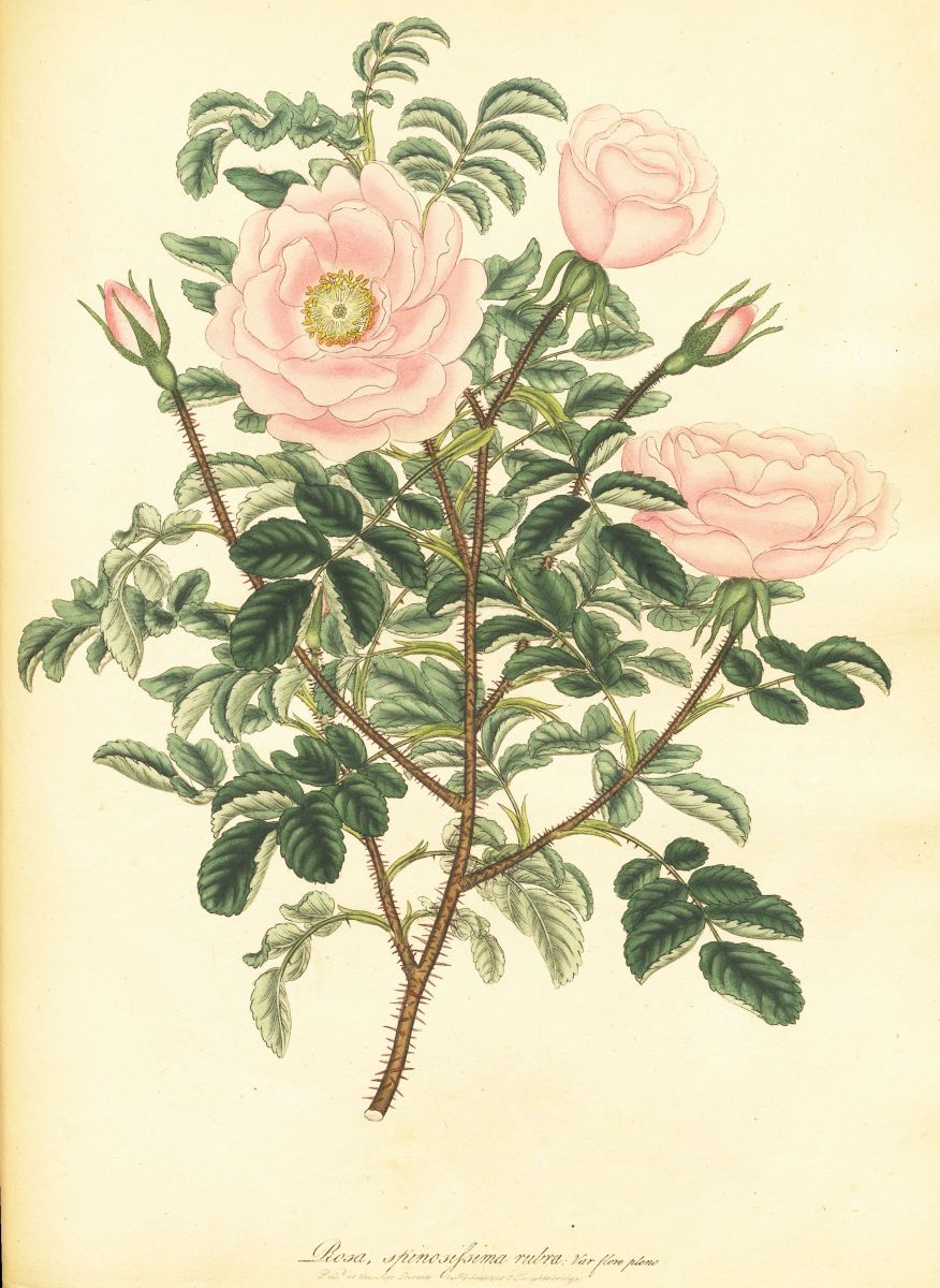 This Rose is a native of Britain, and considered as the first on the list of Garden Roses removed from the common Hedge or Dog Rose, its charming wild original. The flowers are very fugitive, so soon falling off that a specimen in fine bloom is not easily procured. It is the source of several fine varieties, and flowers during the summer months, but is in very few collections.{90}