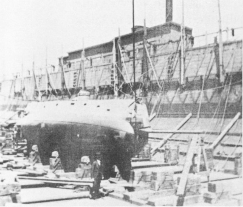 In 1900 the U. S. Navy commissioned its first submarine, the USS Holland, which was built by John P. Holland. It is shown in dry dock at Perth Amboy, New Jersey, in 1898.