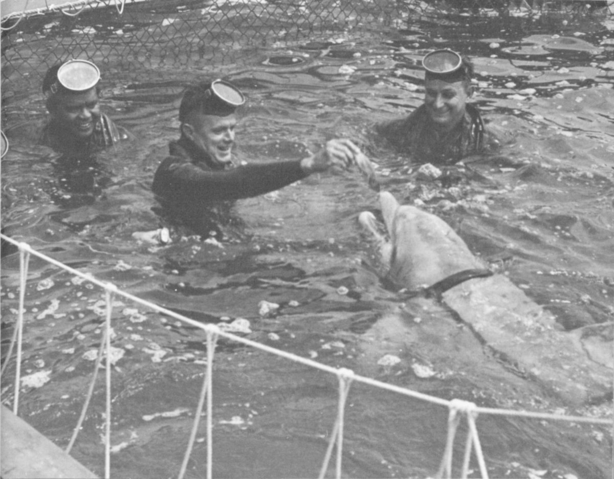 Navy men preparing for undersea research by feeding Tuffy, a friendly porpoise, which later carried messages for them during the “Man-In-The-Sea” experiment. (Also see photos on page 12.)