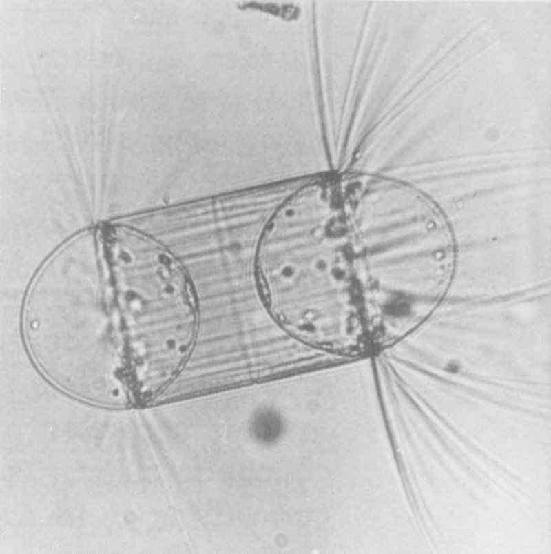 A dividing cell of the diatom Corethron hystrix. Diatoms, one-celled photosynthetic plants, are the primary producers of organic matter in fresh waters.