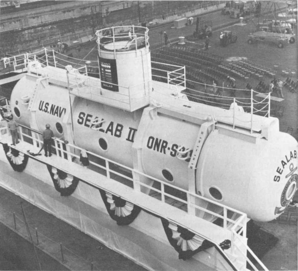 In 1965 the U. S. Navy conducted a 45-day experiment in its “Man-In-The-Sea” program in which 10 aquanauts lived and worked 205 feet below the surface of the sea off La Jolla, California. Their undersea base was Sealab II shown at her christening.