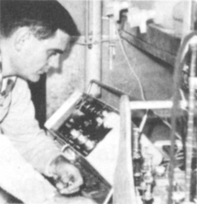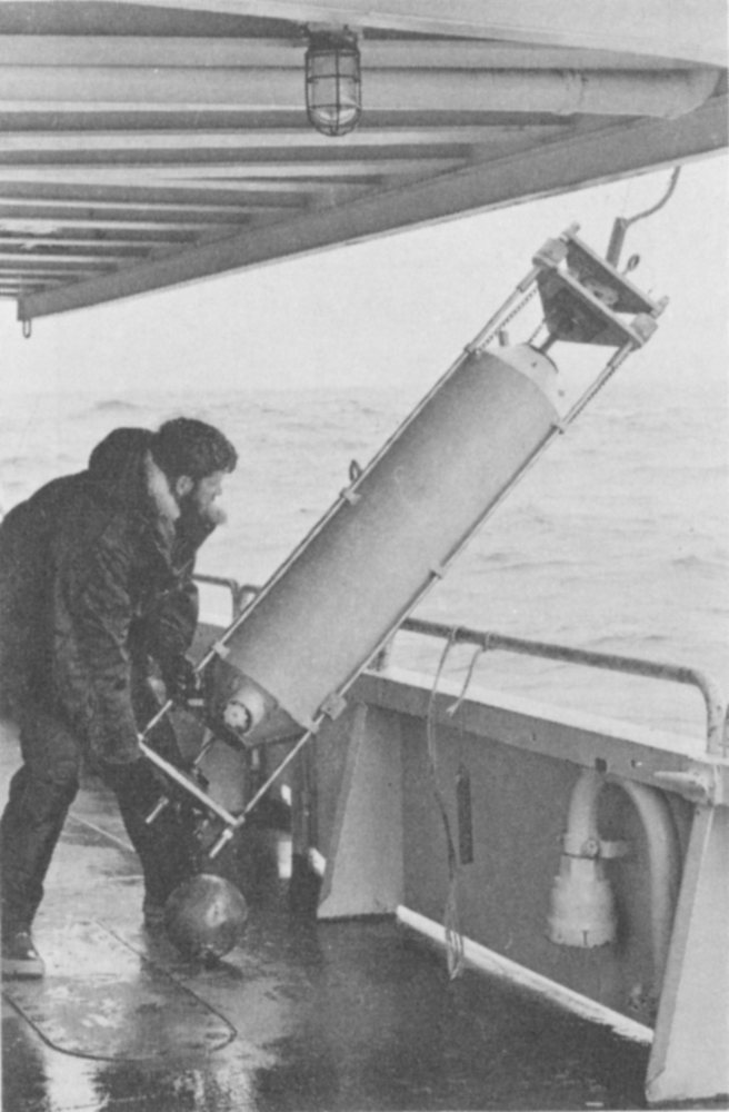 The Nansen bottle, shown being attached to a hydrographic wire, is one of the standard tools of oceanology. When a bottle reaches a desired depth, a sliding weight tips it upside down to collect seawater samples. Thermometers on the sides of the bottles record temperature. The device was designed by the Norwegian oceanographer and explorer, Fridtjof Nansen. (See photo on page 56.)
