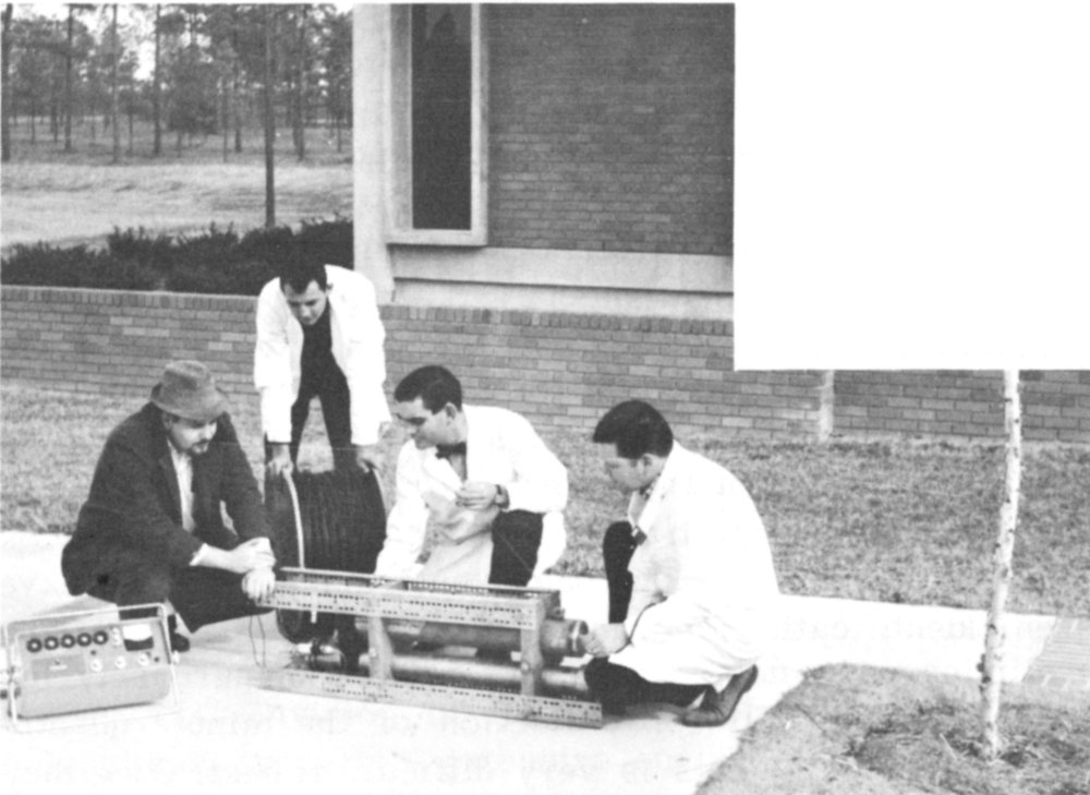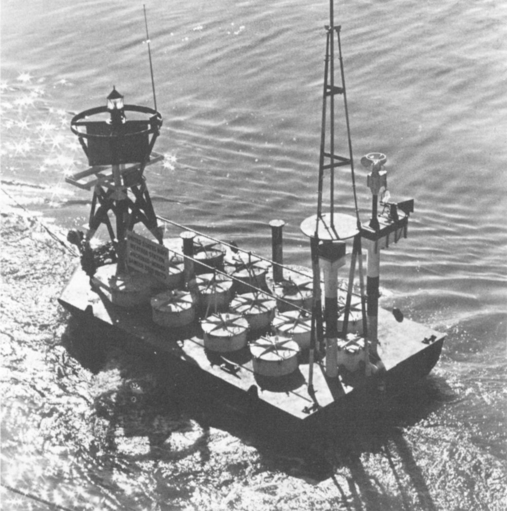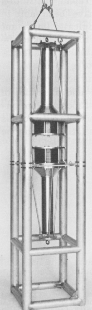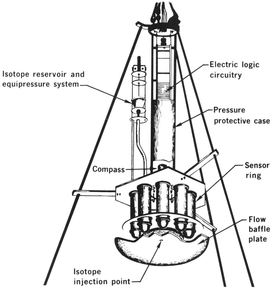 For this exploration, men need to put instruments, navigation beacons (see figures on pages 46 and 47), and other devices on the deep ocean floor, where they must operate for long periods of time unattended and with no external source of power. Radioisotope-powered generators, capitalizing on the energy of disintegrating radioactive atoms, are almost the only devices capable of fulfilling these requirements.[2] Man also wants to do productive work under the ocean, such as drilling seafloor oil wells, mining, and salvaging for profit some of the tens of thousands of cargoes lost at sea during thousands of years of ocean commerce. Eventually, he even wants to farm the ocean floor.